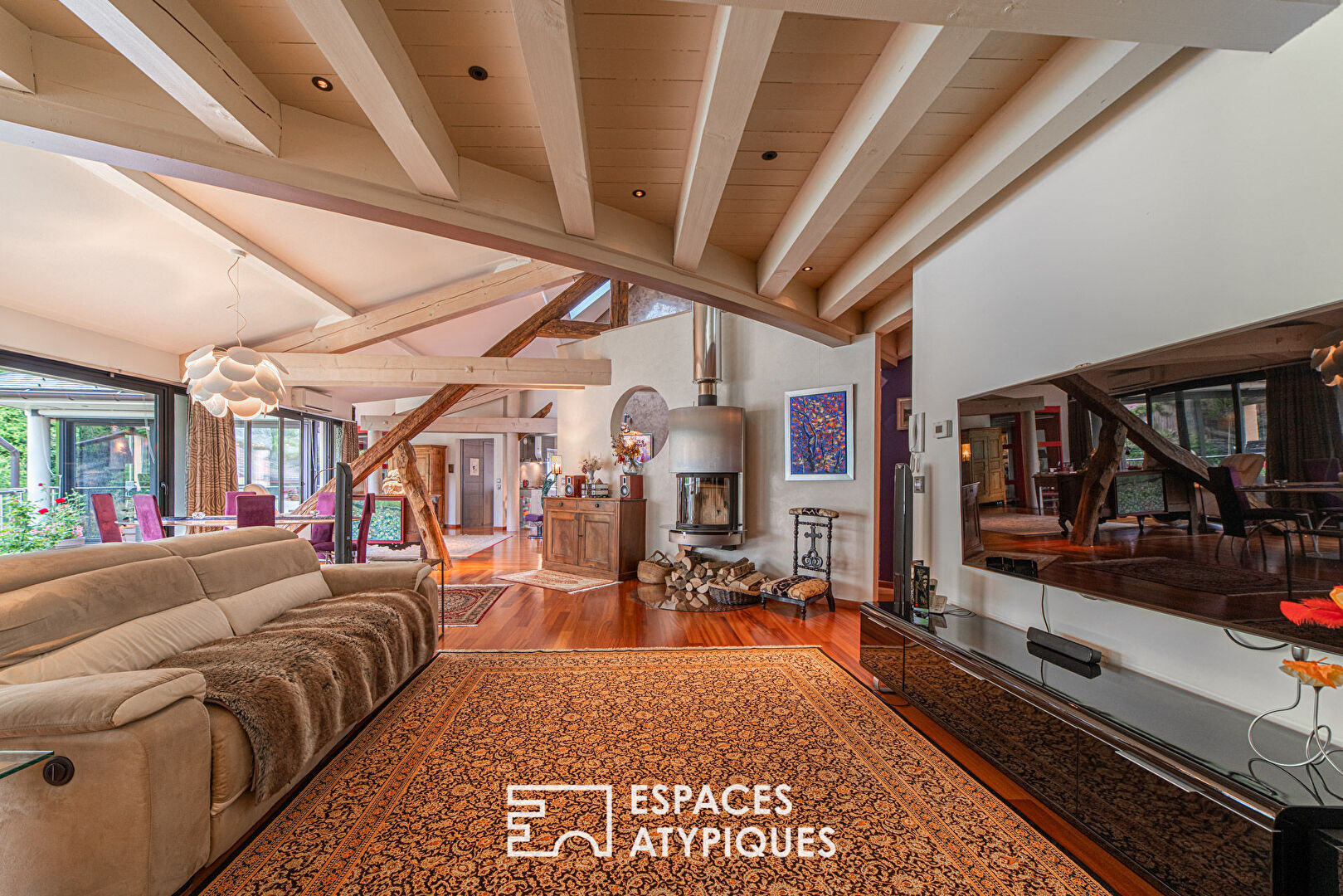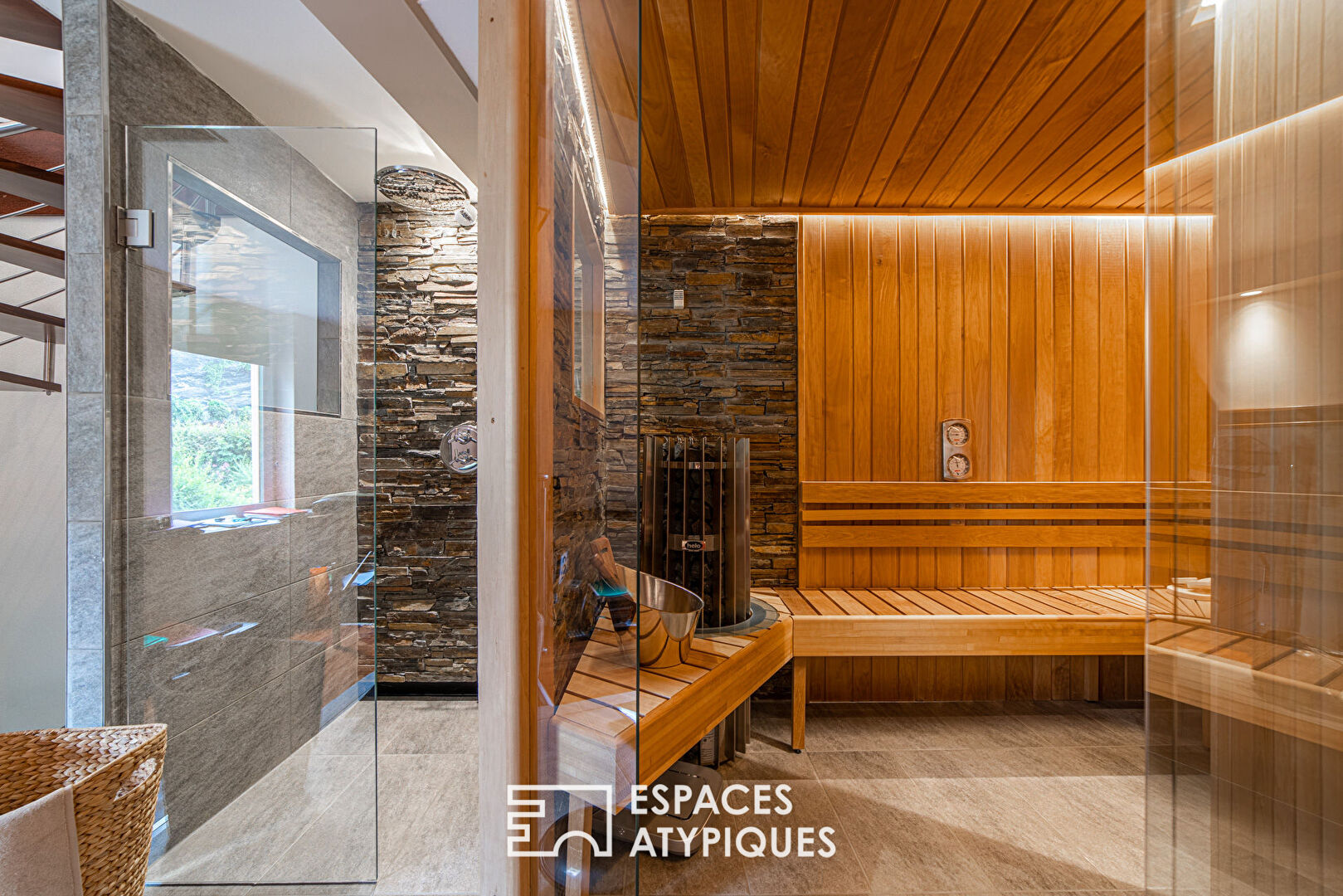 The living room, dining room and office spaces which take place in this vast open-plan volume, boast beautiful light thanks to the entirely glazed facade whose sliding windows allow access to the terrace. A wood insert warms up the living spaces.