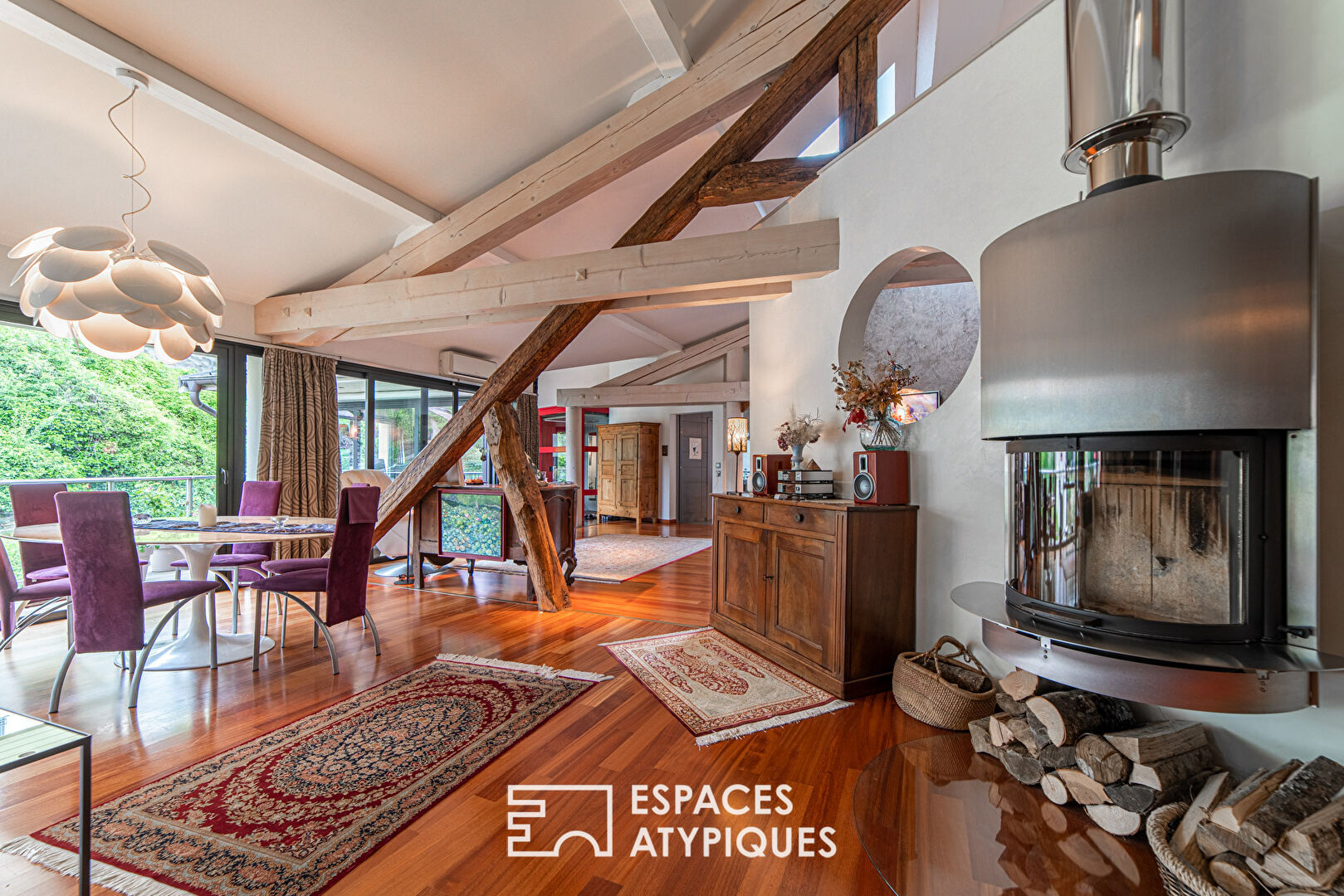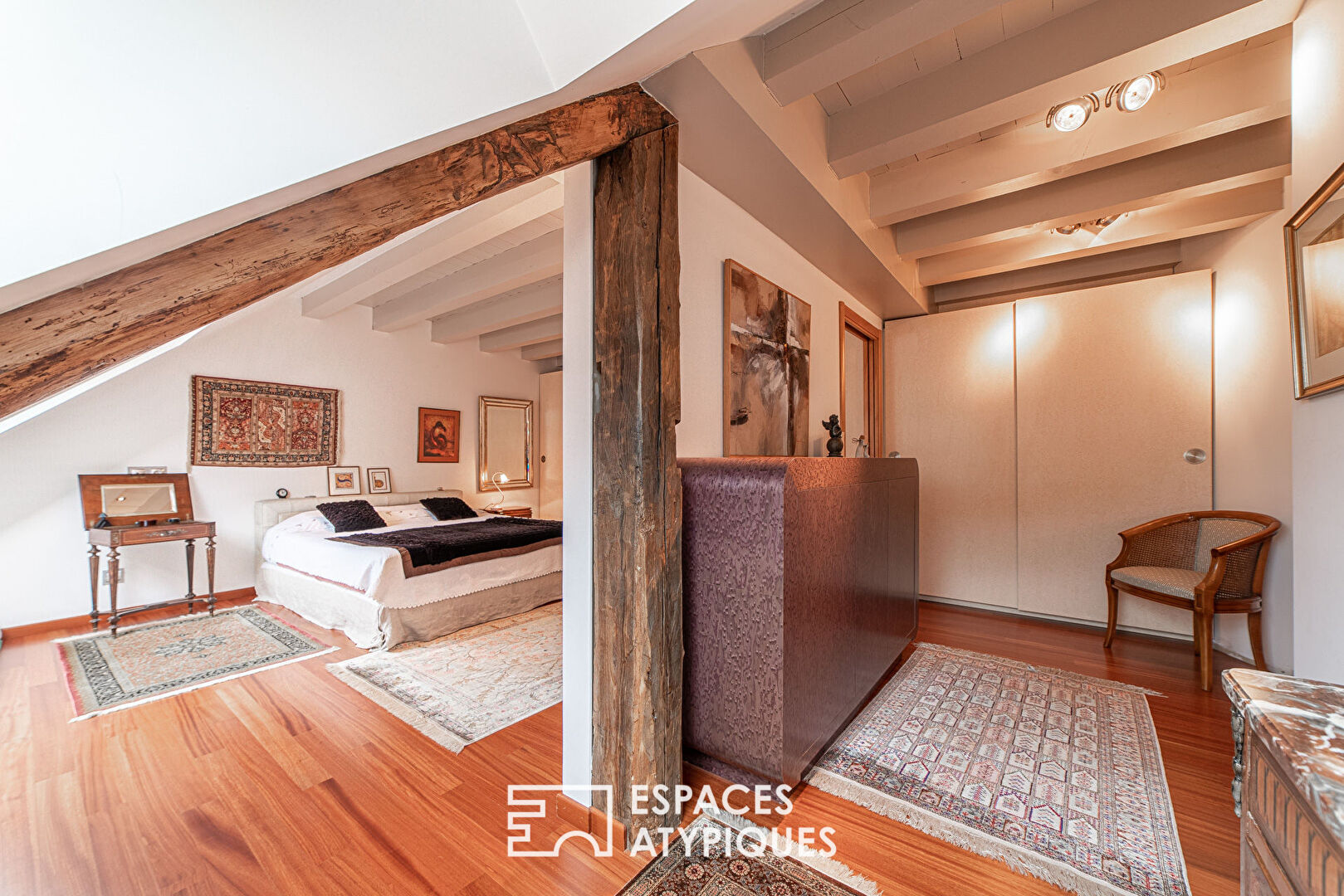 On the upper level, located behind a beautiful office space set up on the mezzanine, another bedroom with bathroom is accessible from the glass staircase custom-made by a craftsman.
