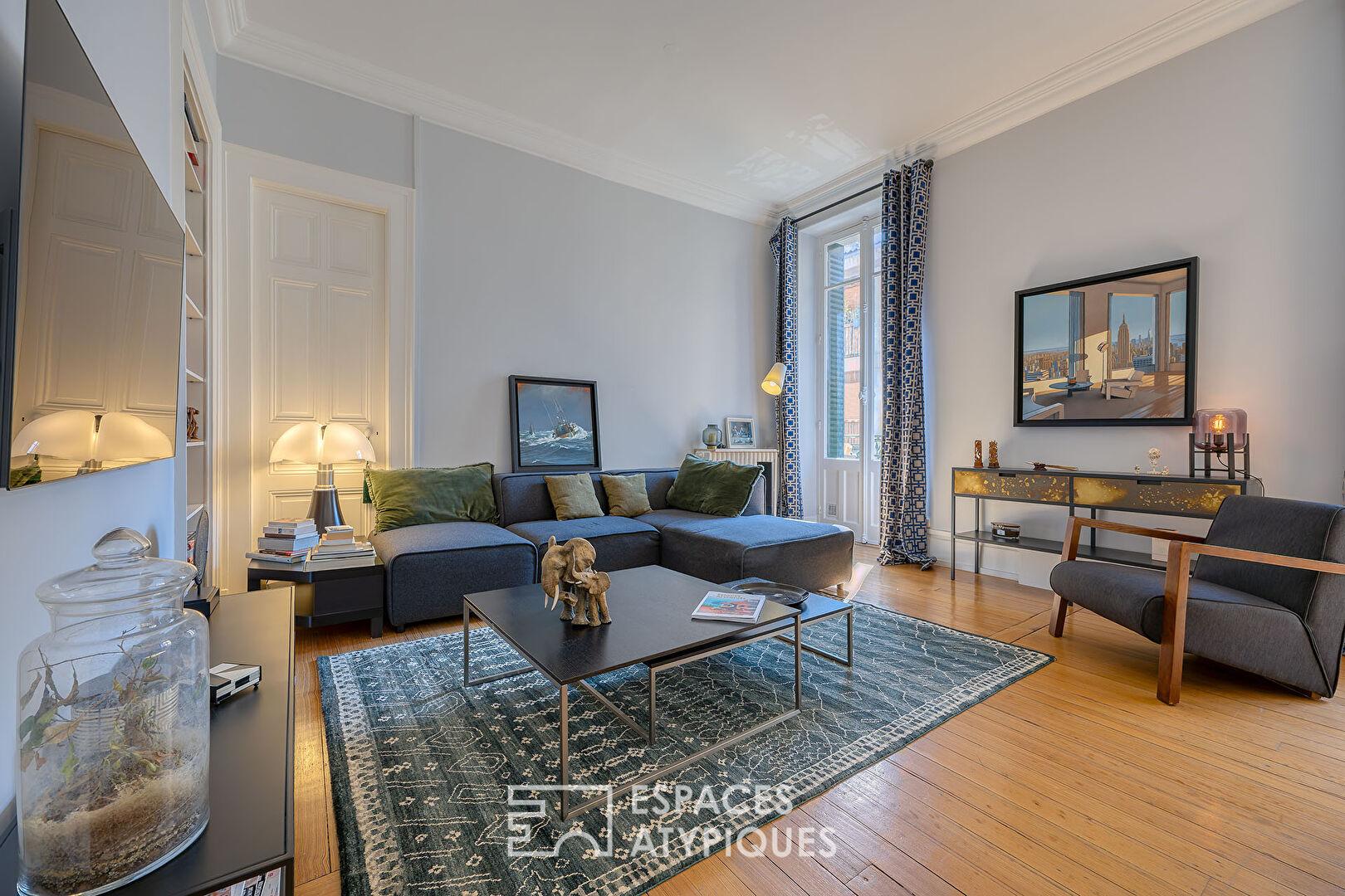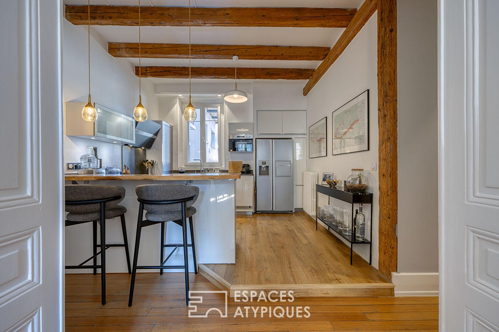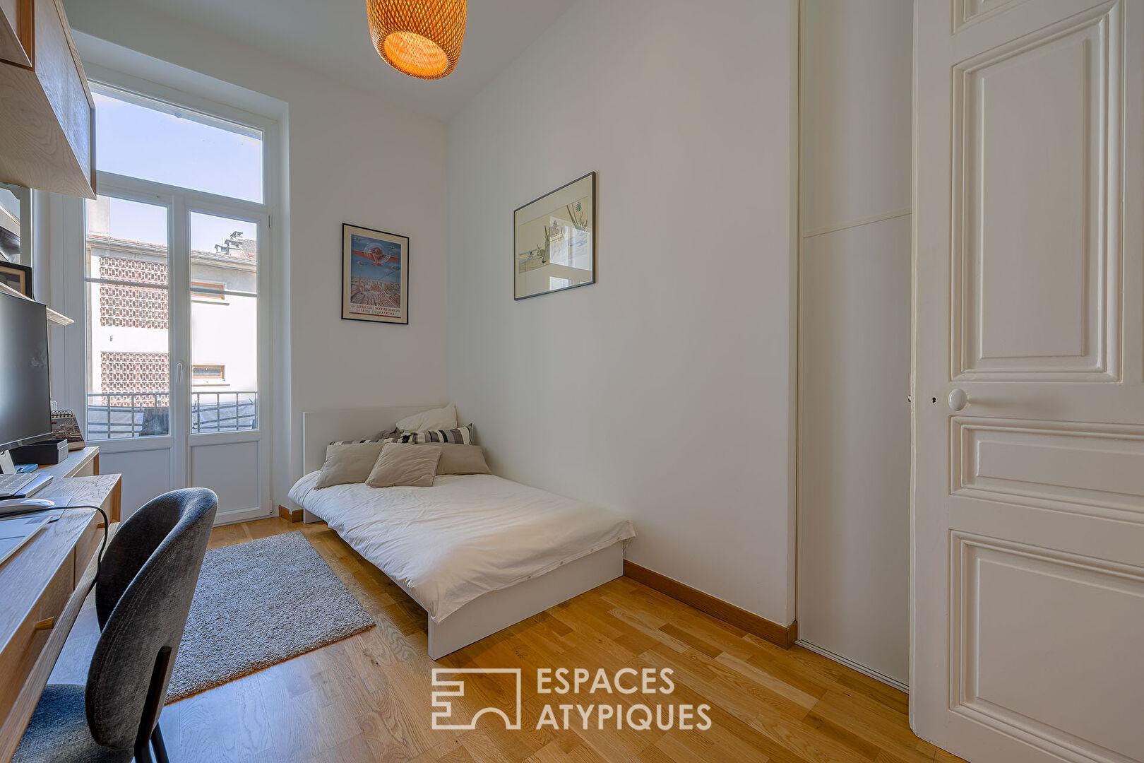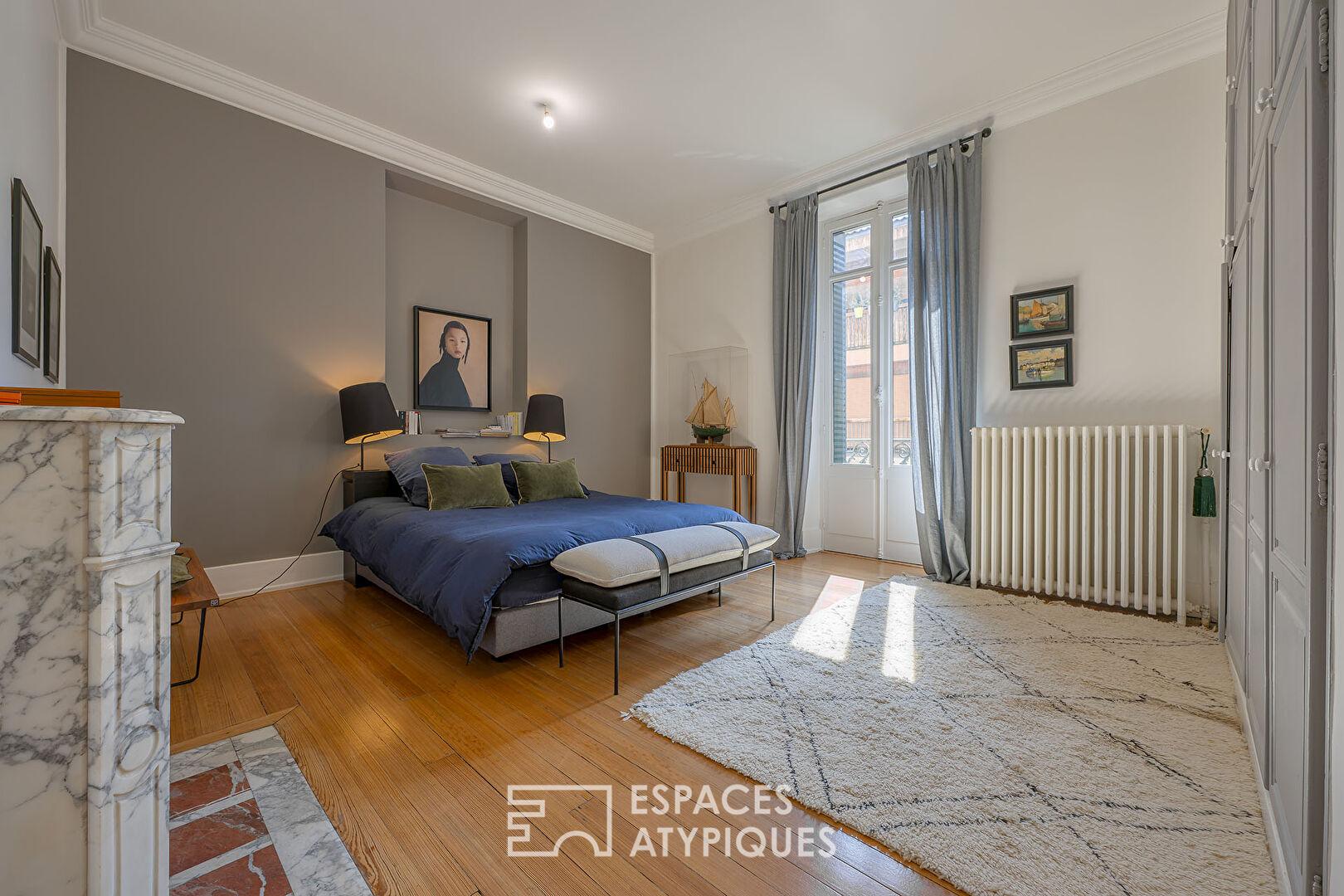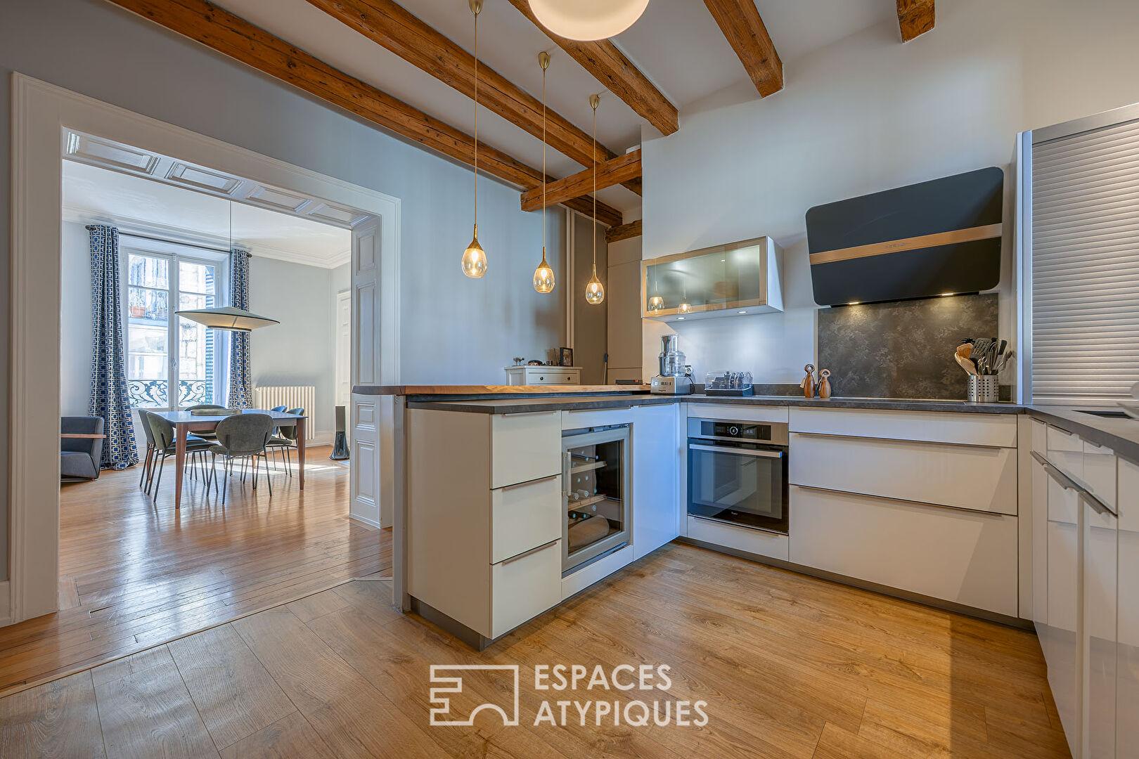 The 31 sq m reception room is a true homage to Haussmannian style: original solid wood parquet flooring, refined moldings, a marble fireplace, and access to a typical balcony offering views of the city center. Echoing this elegant living room, the fully equipped, semi-open-plan eat-in kitchen adds a warm touch with its exposed beams and central island, perfect for convivial gatherings.