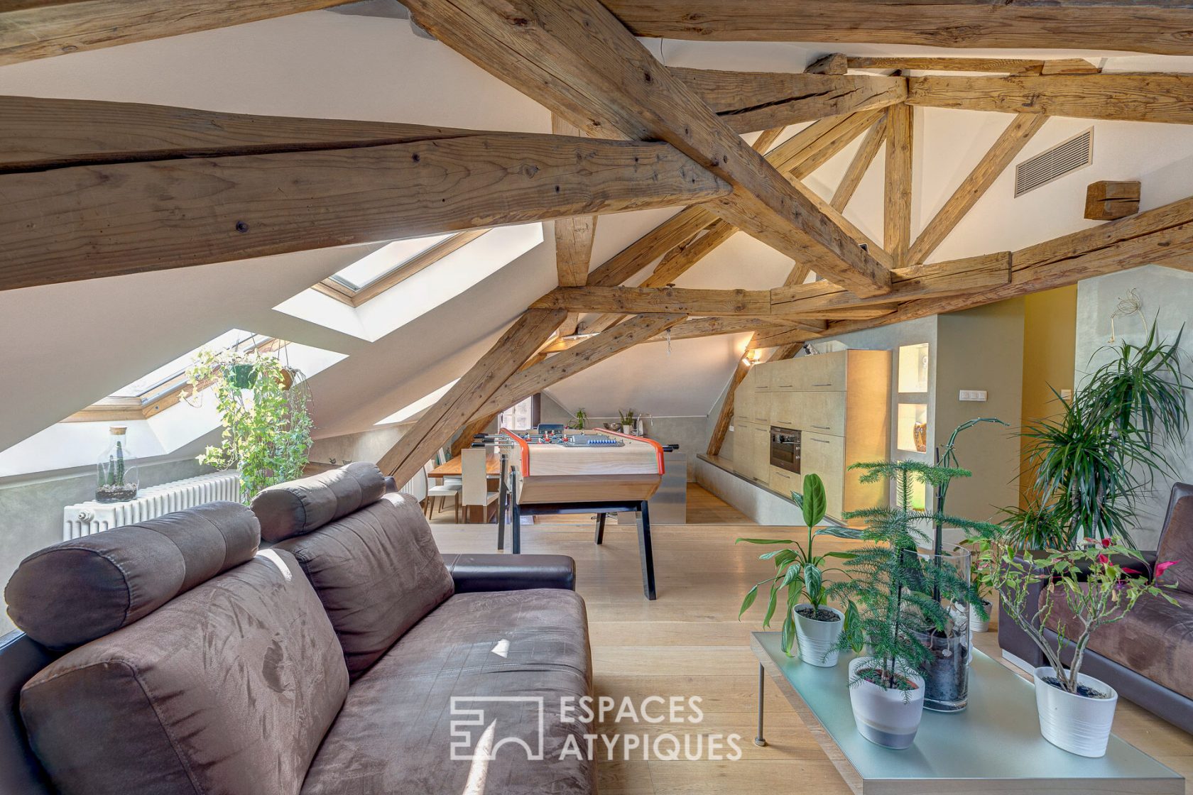 Located in the popular town of Vétraz-Monthoux, just 15 minutes from Geneva, this exceptional 202 sqm – 148 sqm Carrez penthouse – enjoys a panoramic view of the Salève, the Jura, Geneva, the Voirons and the roofs of the city, comfortably installed on its exceptional terrace of 90 sqm.