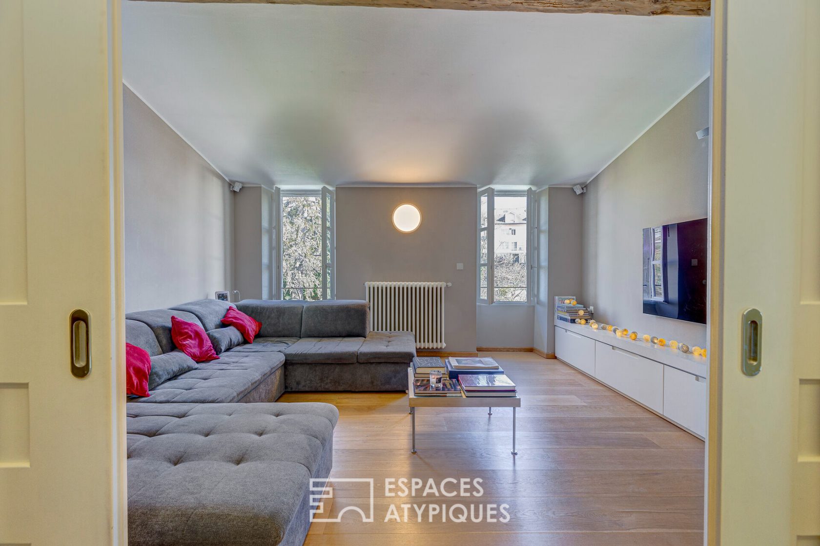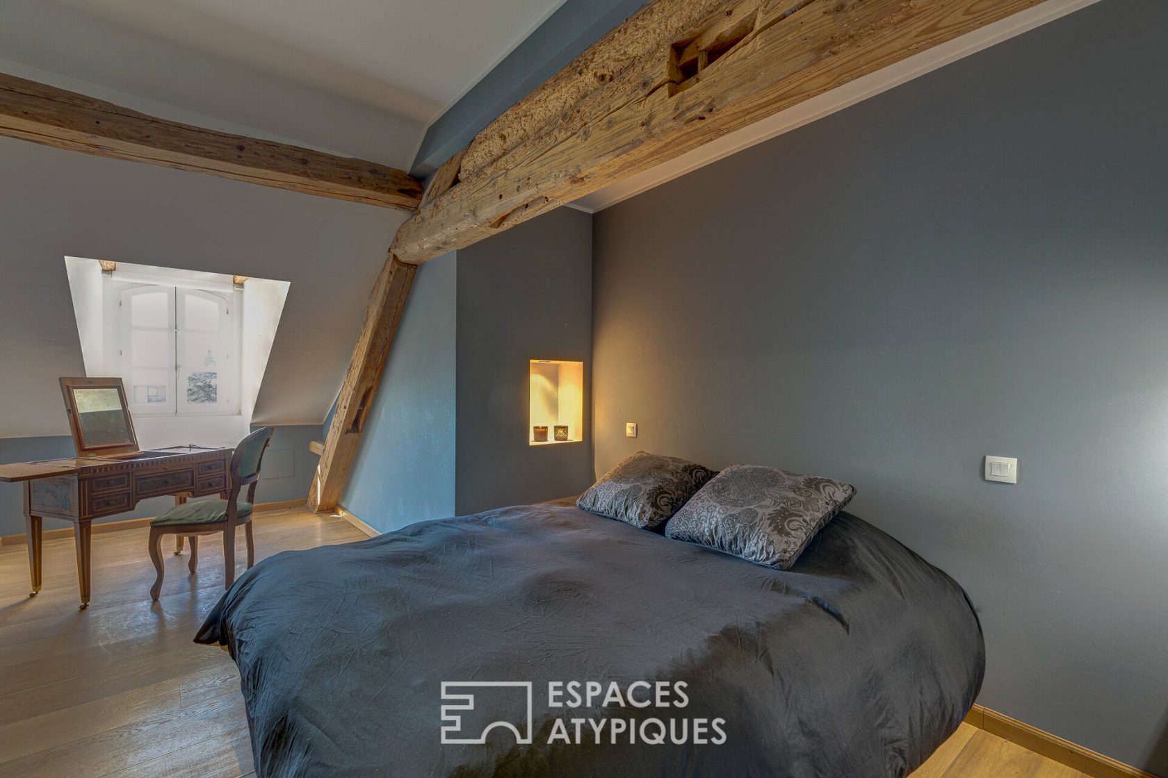 Nestled on the top floor of a 17th century castle, the volumes it offers are spacious. Fully custom-made with quality materials, the apartment offers three bedrooms with the possibility of creating a fourth, including a suite with its own bathroom and dressing room. All are fitted out with made-to-measure, resolutely contemporary and high-quality storage. The second bathroom, dressed in Terrazzo flooring, is nestled in one of the towers of the castle and notably offers a spa bath. Everywhere, the cachet of the old is sublimated by the noble materials which dress the spaces: the solid oak parquet floors highlight the golden hues of the exposed frame which covers the bedrooms and the living room.