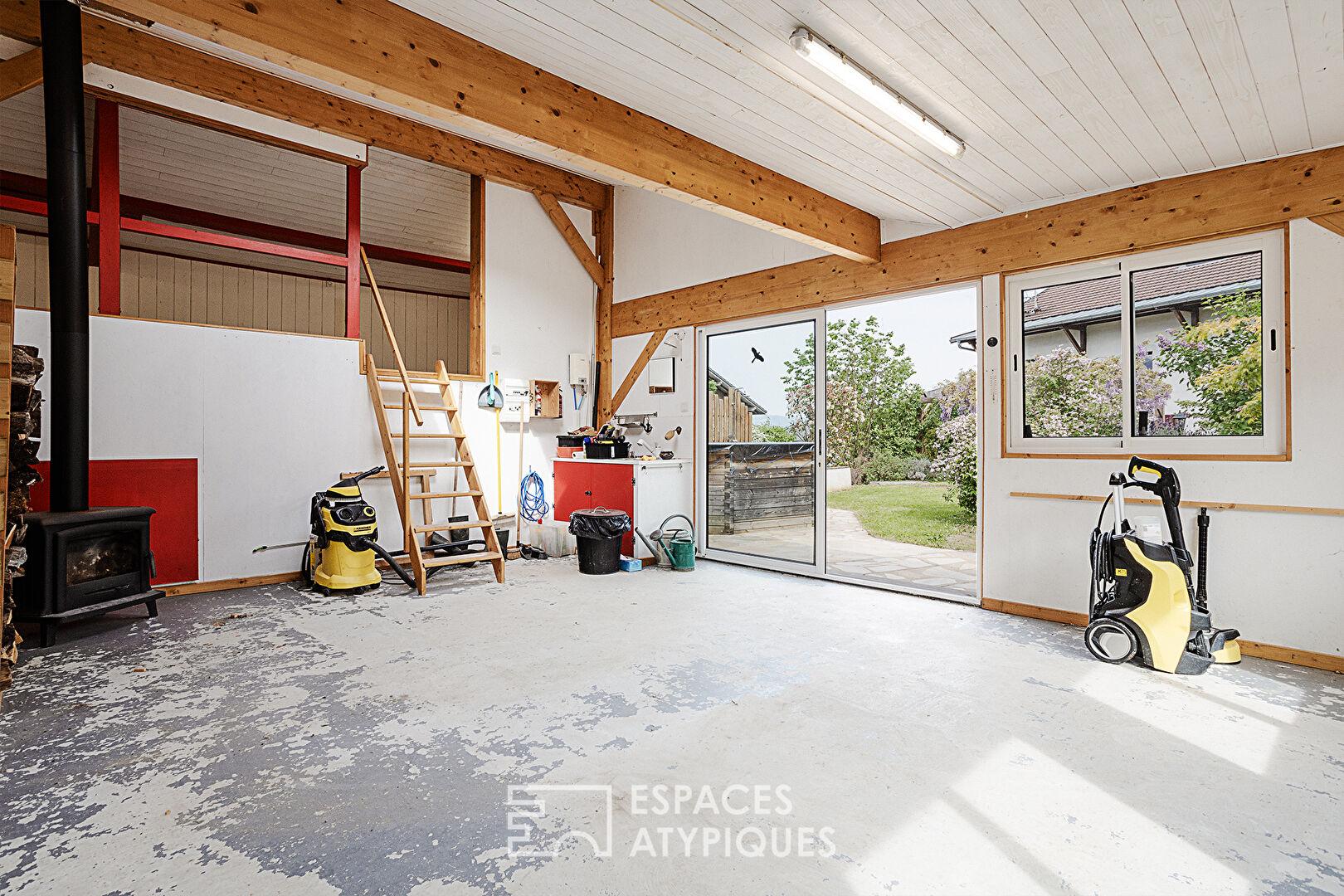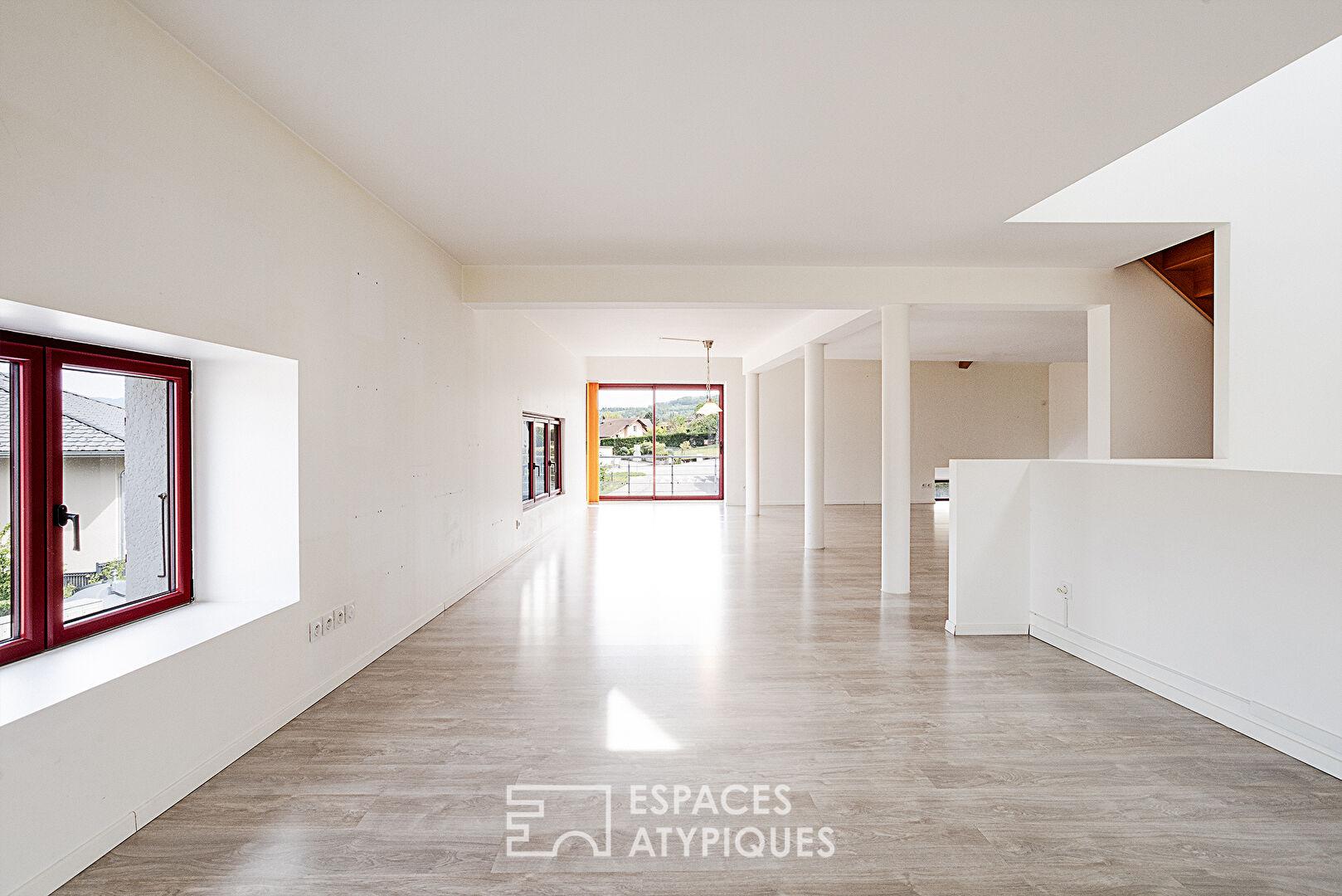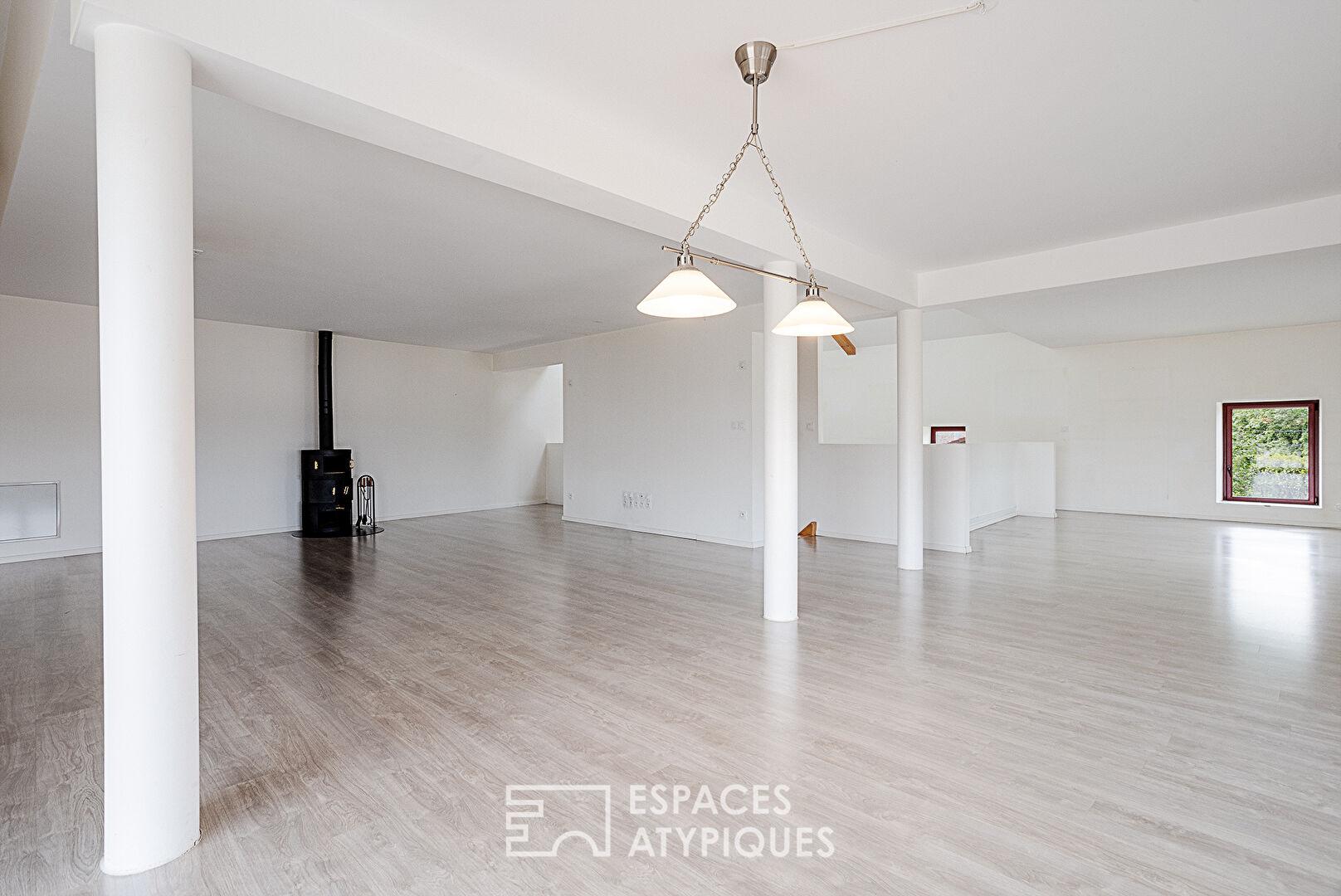 From the moment you enter, the tone is set. The ground floor reveals a spectacular living room with a cathedral ceiling, bathed in light. This reception area incorporates a fully equipped modern kitchen, opening onto a vast living-dining room that seamlessly extends the living space into the garden. This level also includes a master suite with a walk-in shower and laundry room, as well as a second multipurpose bedroom, ideal for an office, an artist’s studio, or a professional practice.