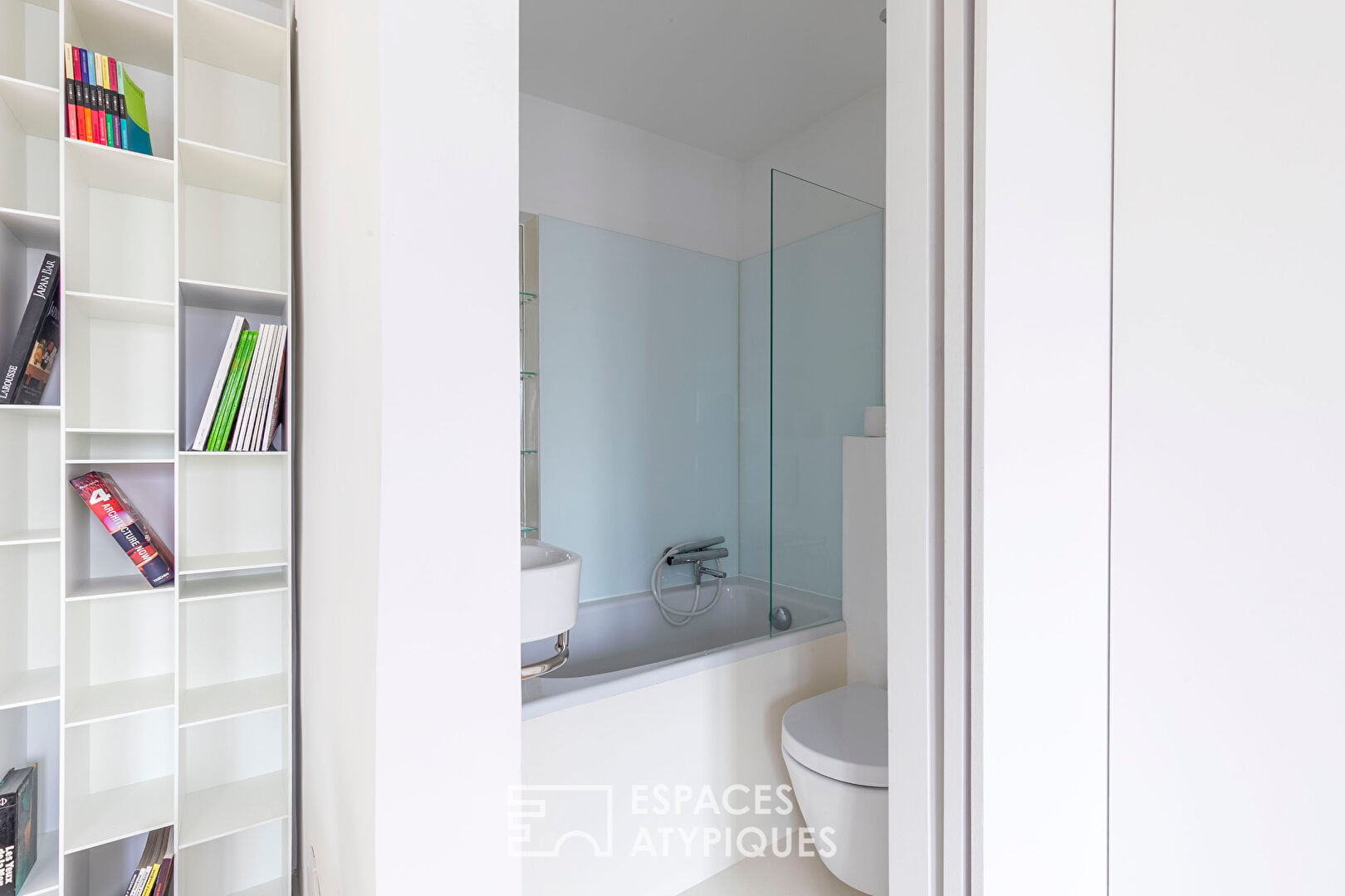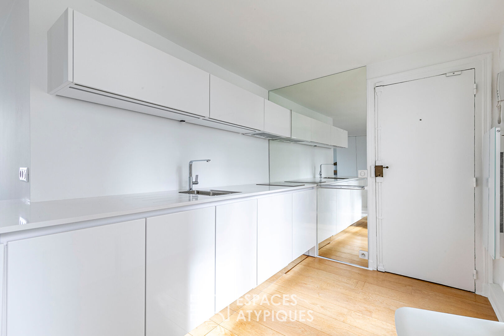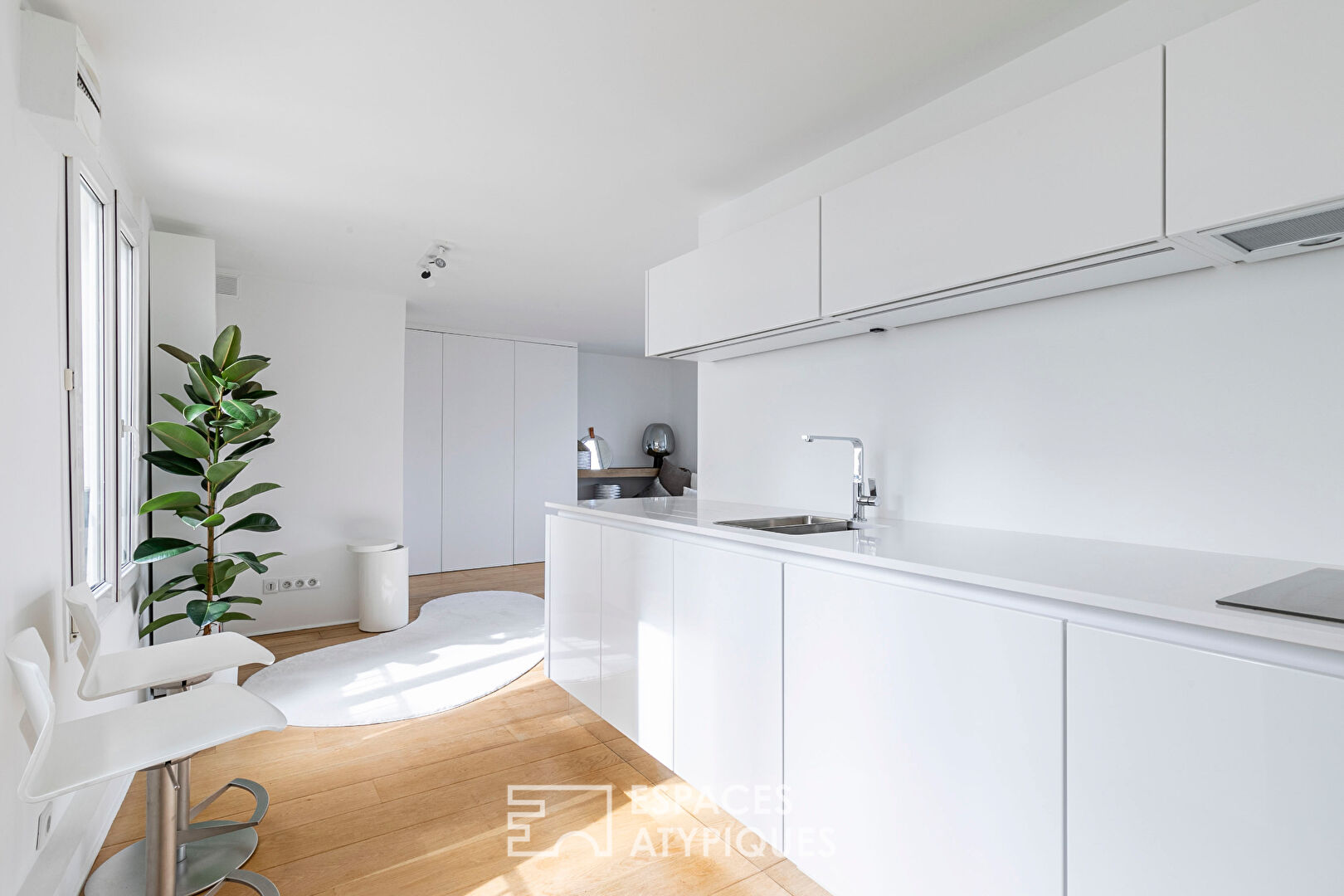 Crossing east-west, it benefits from beautiful light and a view of the rooftops of Paris. Always dressed in white as a common thread, the kitchen is adorned with a marble worktop.