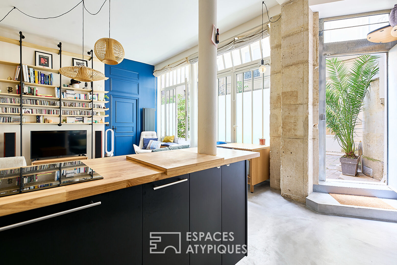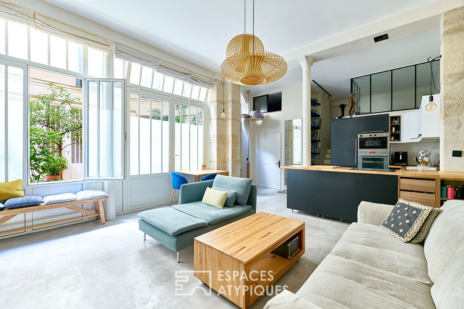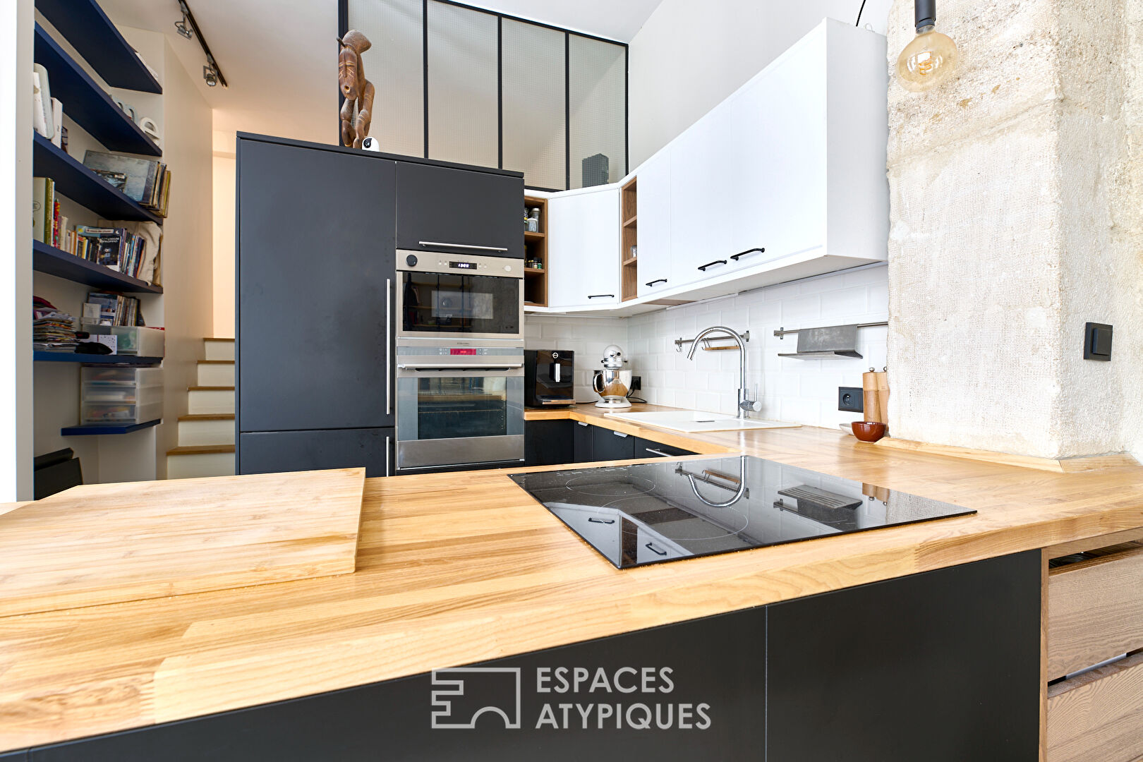 Past the entrance, a vast living space of more than 34 m2 is available to you. This has an open kitchen equipped on a living room decorated with a library, all lit by the large workshop-style bay windows.