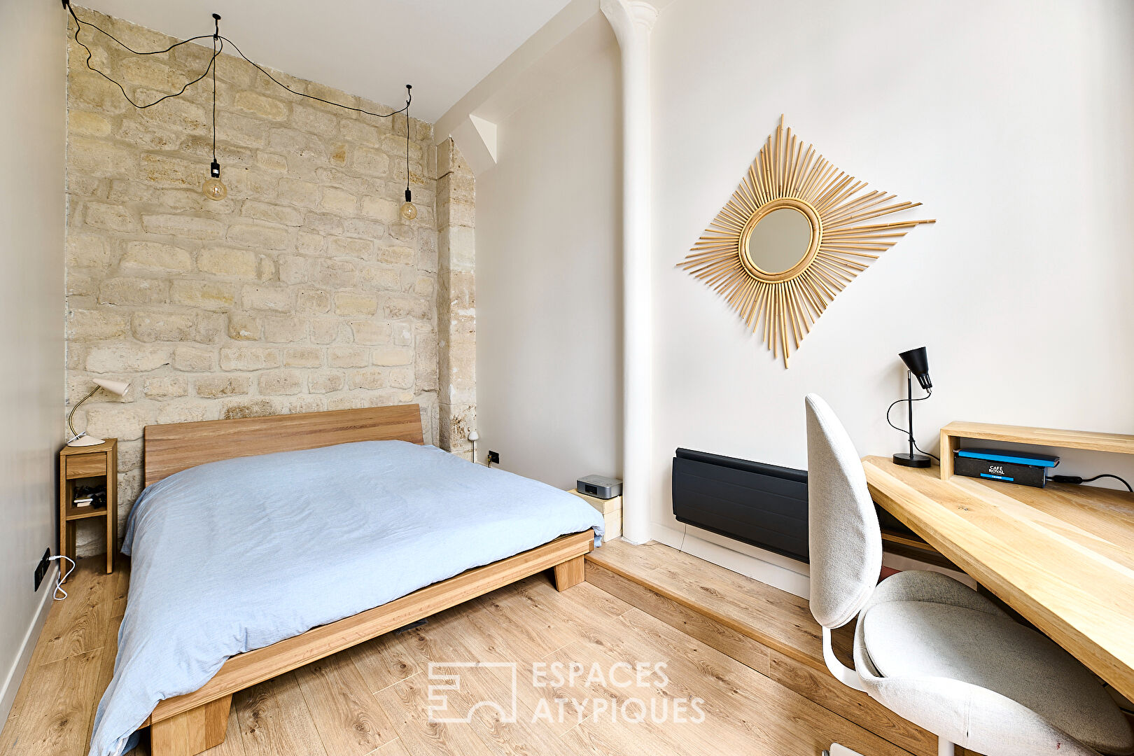 The choice of materials and colors, coupled with the beautiful ceiling height of 3m33 and the exposed stones give it character and authenticity in a very cozy and welcoming atmosphere.