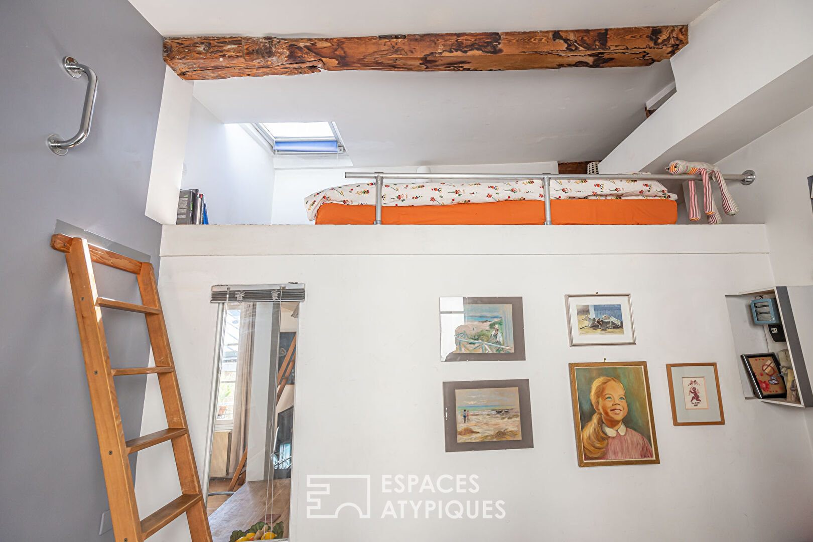 A private staircase leads to a living room consisting of an open kitchen extended by a dining room and a living room under a high ceiling reaching 3.50 meters with its exposed beams. A first mezzanine is accessible from the living room.