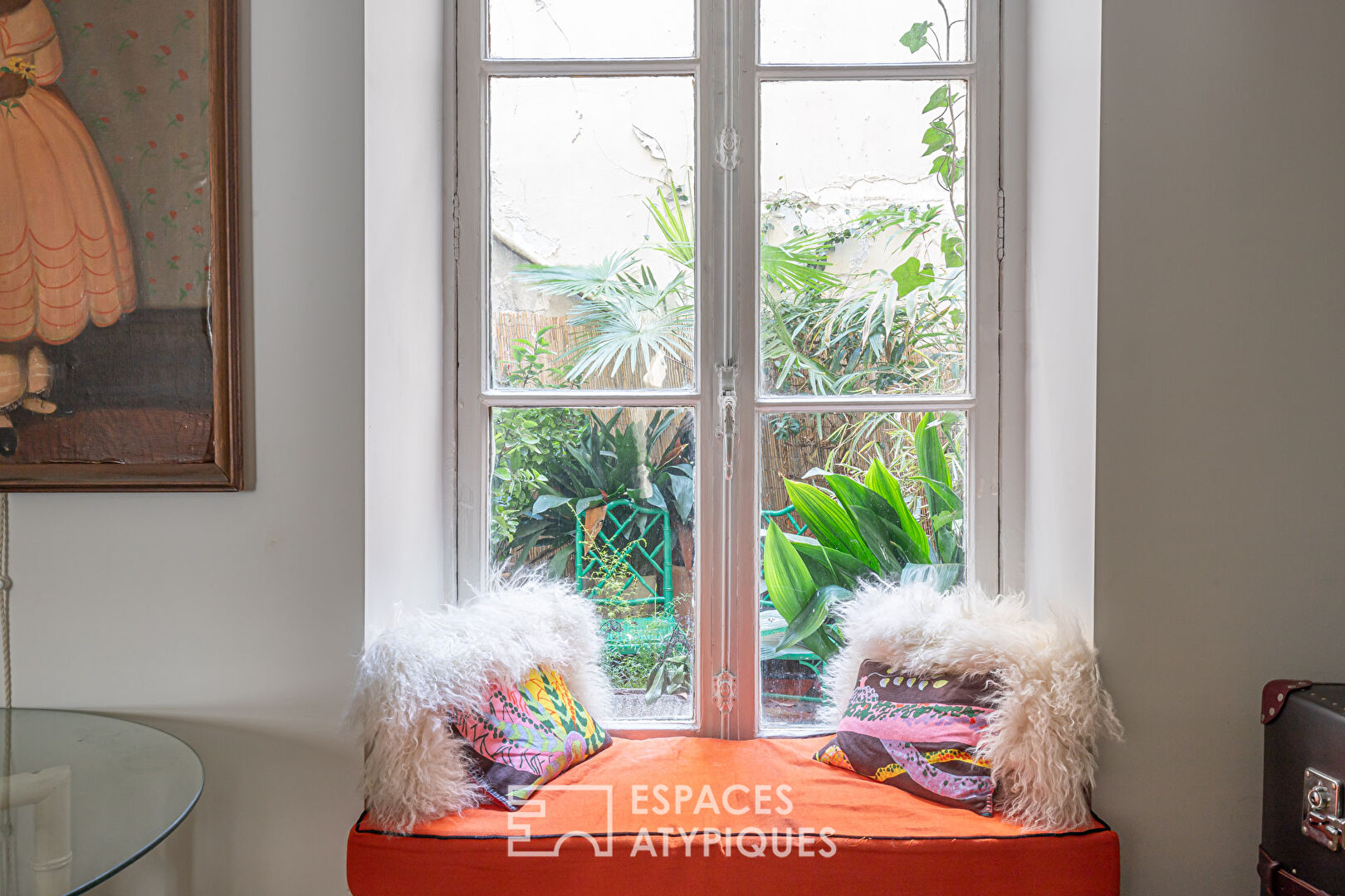 The entrance opens onto a central living room extended by a fitted kitchen giving access on one level to the green courtyard.