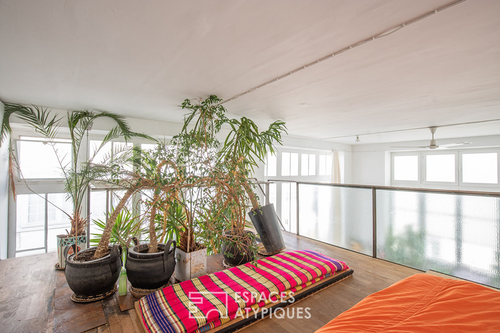 In the peace of a building from the beginning of the 19th century, this loft with generous volumes of 121.72 m² (115.12 m² Carrez) is located on the 1st floor and benefits from a private outdoor space in the paved and tree-lined courtyard.