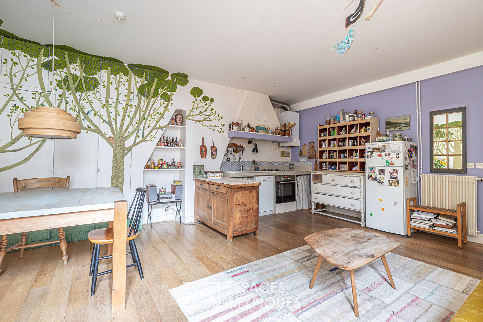 Lots of cachet, parquet and tomettes allied to the singular universe of design and color. Possibility of buying a 30m2 studio adjoining the living room.