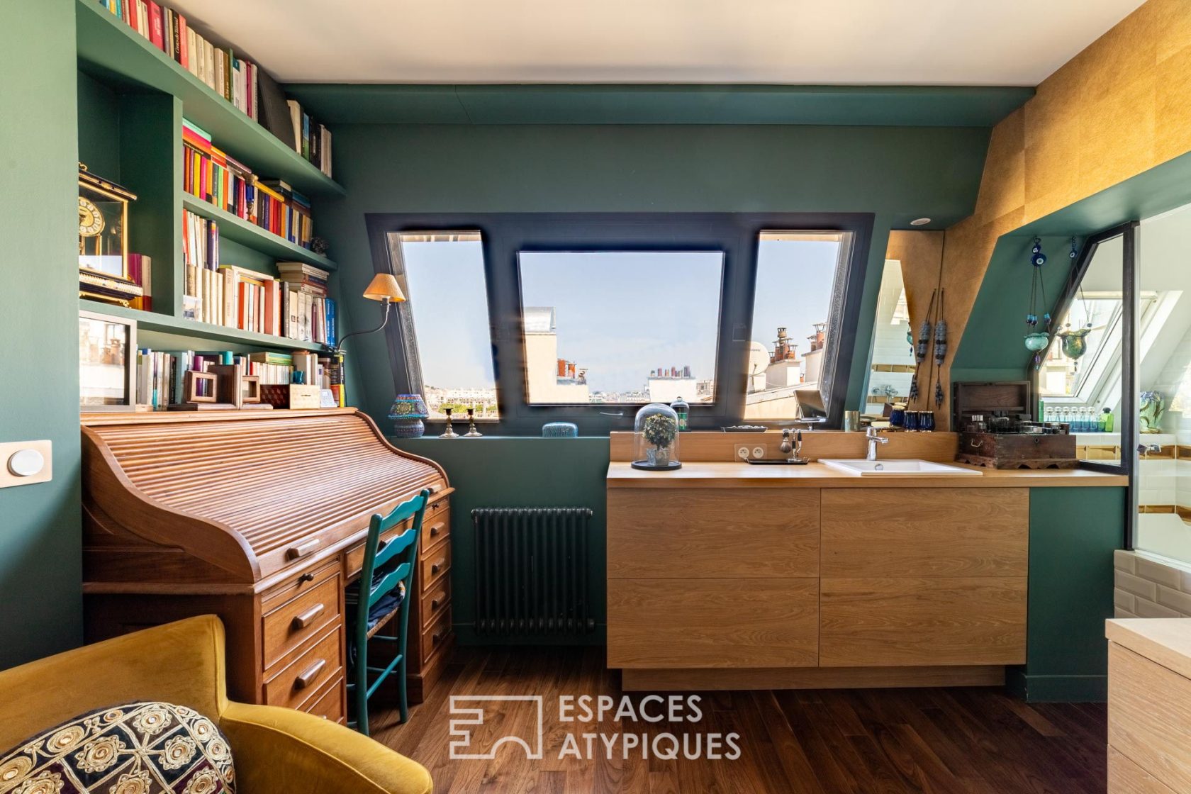An accordion staircase leads to the 6th and last floor to a relaxation lounge under the roof, which can become a second bedroom. This last room is extended by a terrace offering an exceptional view over the Parisian rooftops and two of the most emblematic monuments of the capital.