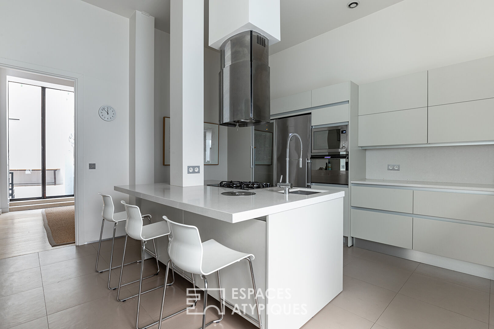 The top-of-the-range architect’s renovation of this double-sided duplex highlights the generous volumes with a ceiling height of up to 4 meters.