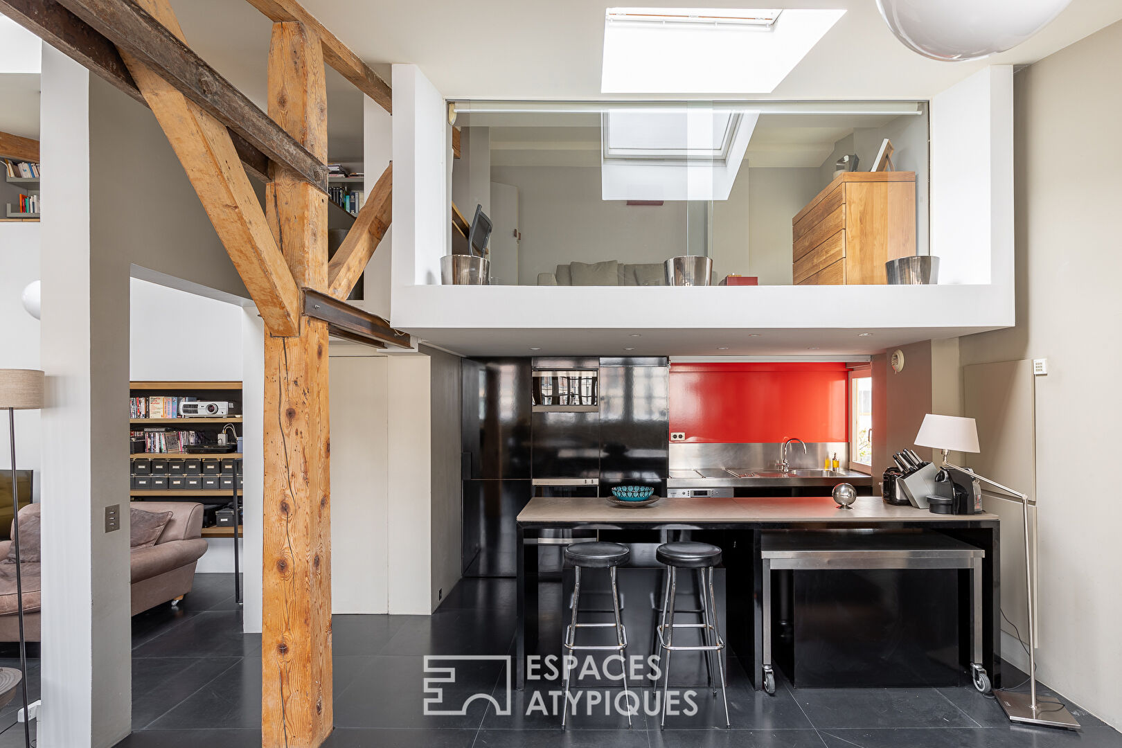 The light diffused by the large openings bordering this living space is enhanced by roof windows.