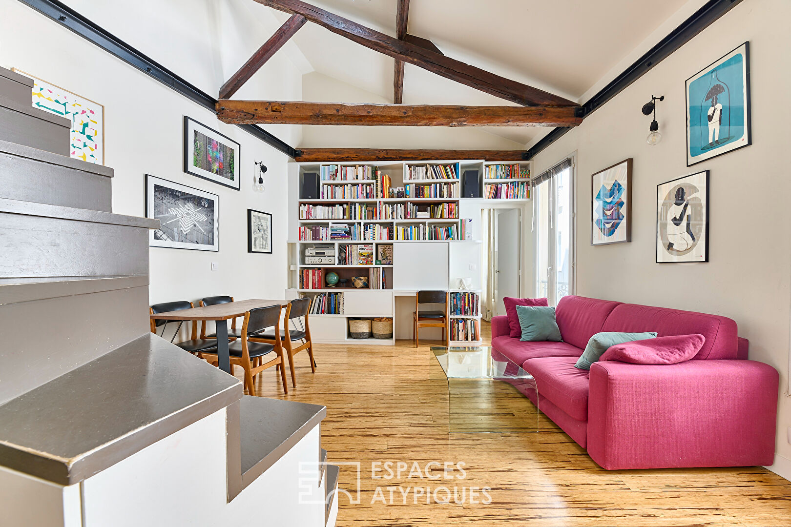 A staircase leads to a mezzanine sleeping area, located under the roof. This space benefits from a skylight which provides soft light and a view overlooking the living room below.