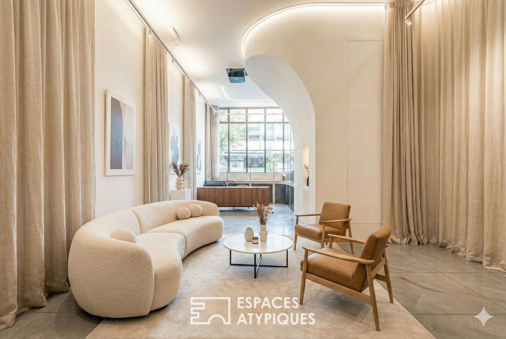 The ground floor is a vast and true artist’s studio that can be easily adapted. It offers multiple layout possibilities, blending noble materials with a contemporary ambiance. With a ceiling height of 4.80 meters and a glass roof that bathes the space in light, it also features an open kitchen. A mezzanine accommodates a living/bed area and a shower room.