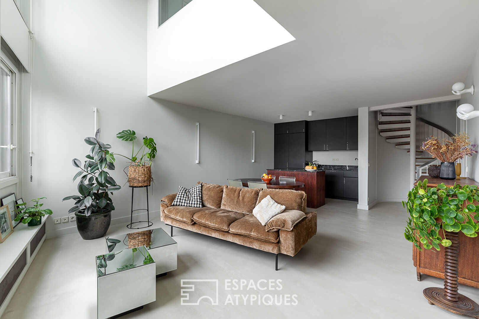 The whole is lit from all sides thanks to the numerous windows which, while emphasizing the double height, offer a partial view of the Eiffel Tower. In a house spirit, the first floor is entirely devoted to the sleeping area.