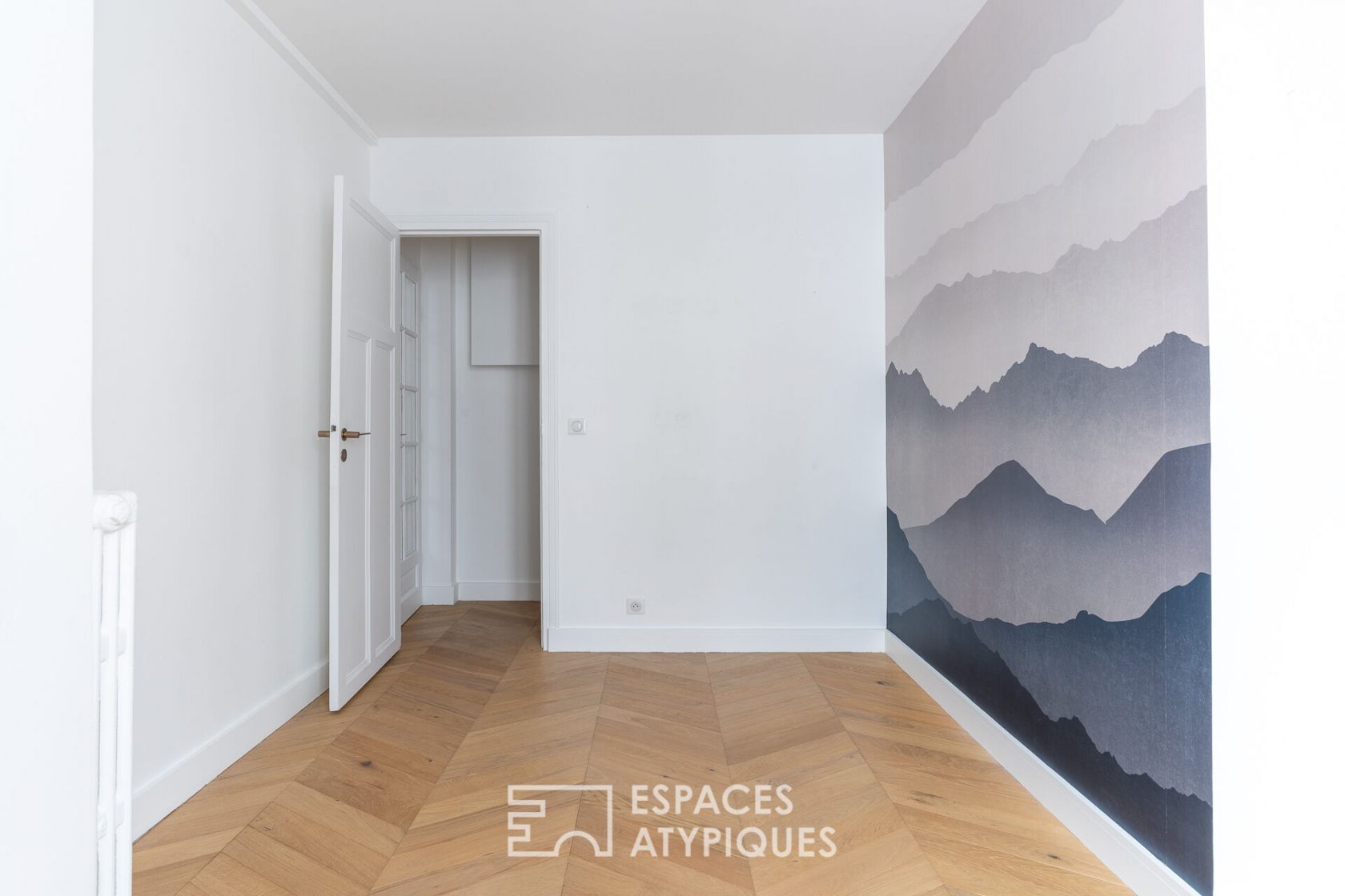 In a quiet cul-de-sac in the 15th arrondissement, a few steps from the Eiffel Tower and the Champs de Mars, this apartment overlooking the courtyard has a surface area of 70sqm (70.02sqm Carrez). The property completely renovated by a real estate professional in 2020 is on the second floor with elevator of an art deco condominium from 1930.