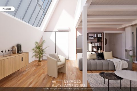 On the lower level, the entrance leads to a 30m2 living room with 4.70m ceiling height as well as the bedroom and its small balcony.
