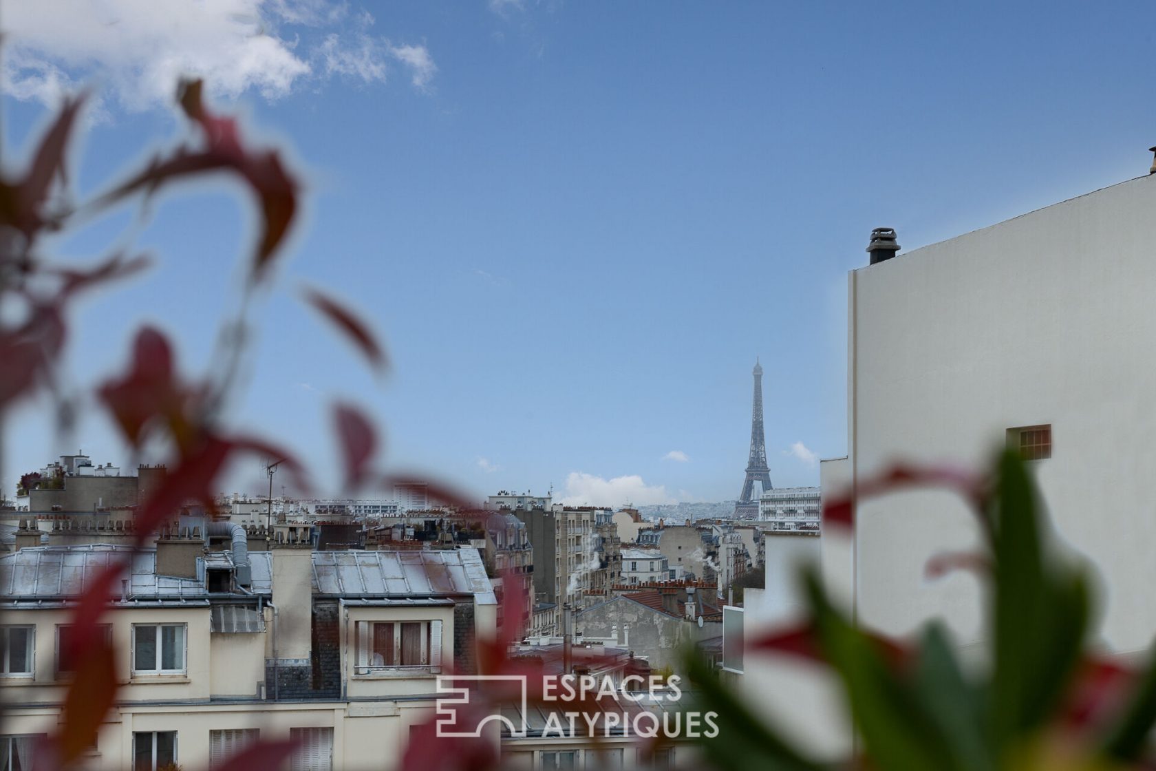 Above, the roof-terrace enjoys 360° sunshine and a view of the Eiffel Tower.