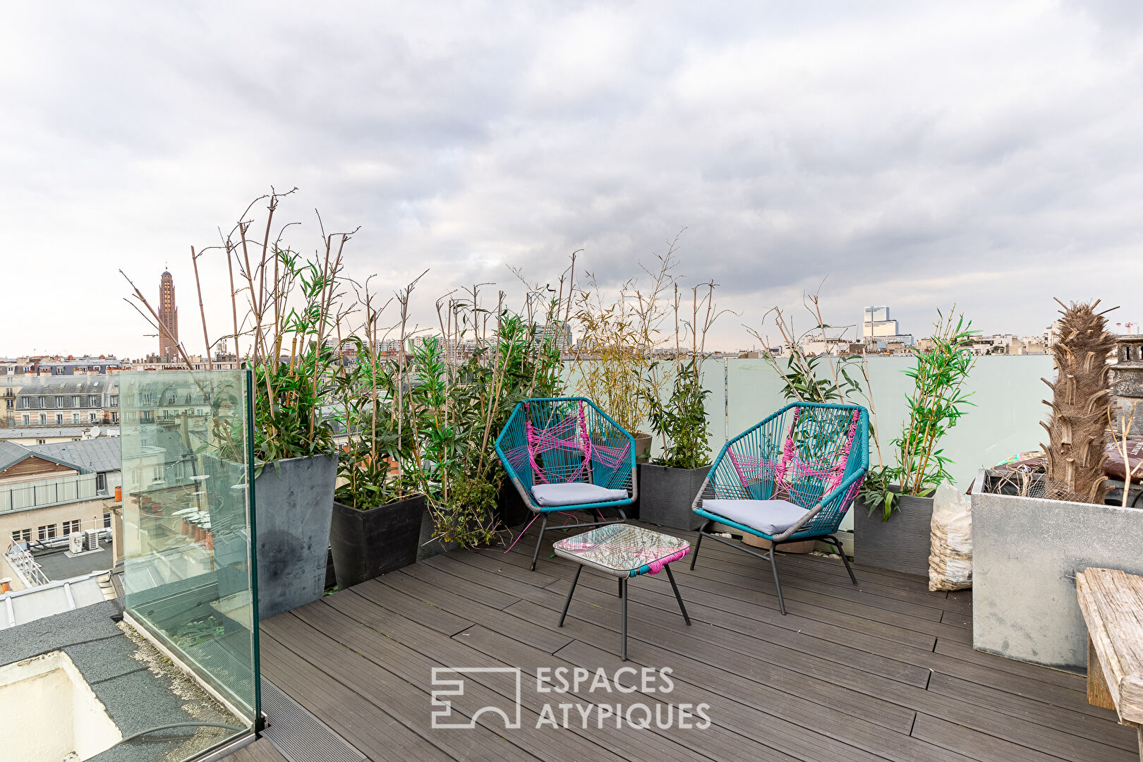 The connection to the floor and the sleeping area is via an air staircase. The bedroom is equipped with a retractable platform bed and opens onto the roof terrace which enjoys a 270° view of almost all of Paris and its zinc roofs. There, a sauna has taken up residence to complete the picturesque.