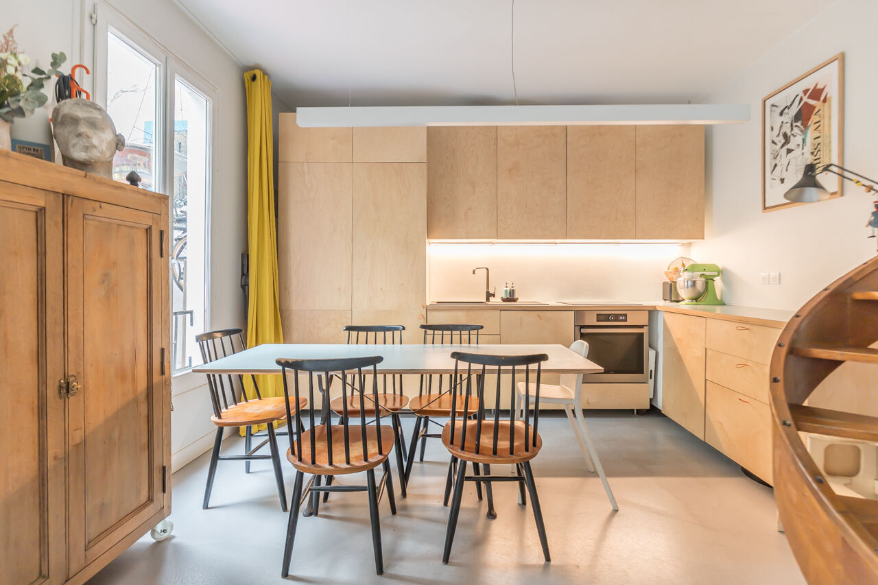 Rue d’Oran charming house redesigned by architect of 56m2 (49.92m2 Carrez) benefits from a shared courtyard of 23m2. The ground floor offers a beautiful living room of 22m2 with an open kitchen.