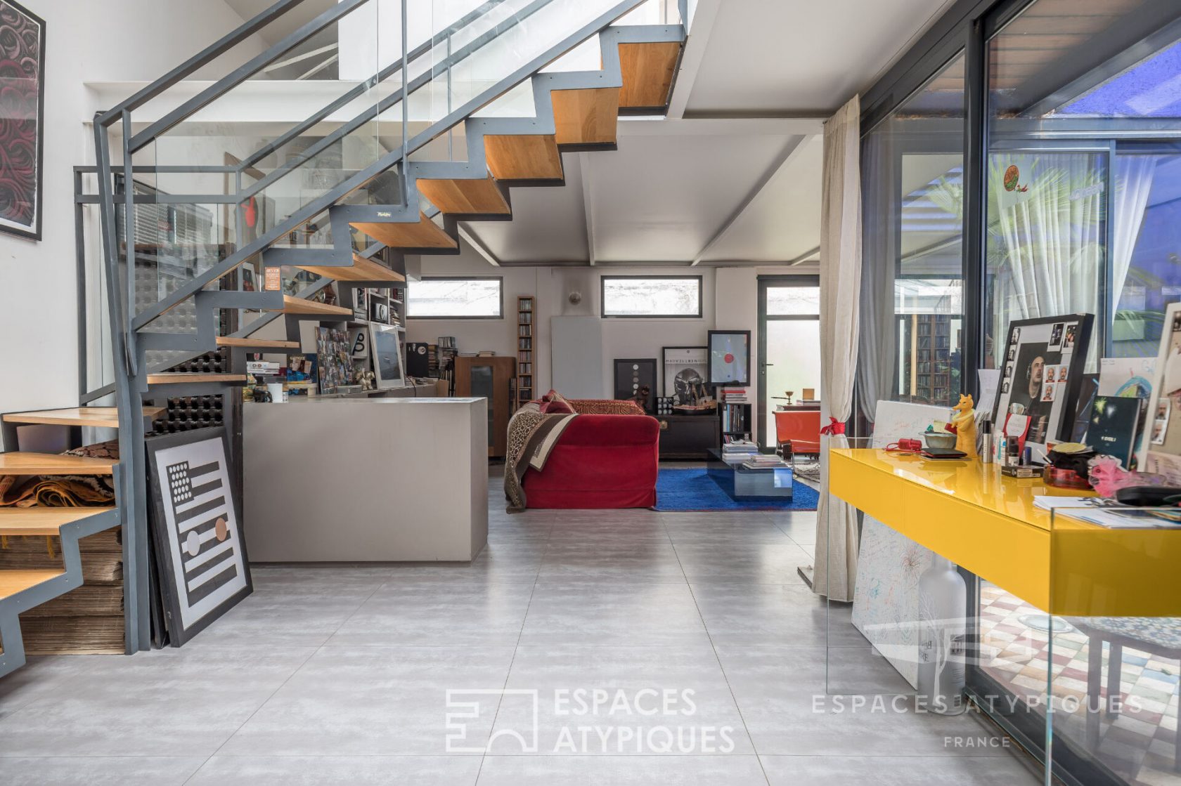 Close to Marché de l’Olive and Piscine Heber, in a quiet courtyard of a well-kept co-ownership, this comfortable 136 m2 (132 m2 Carrez) loft house with 13 m2 patio is the result of renovation by an architect of a former hangar.