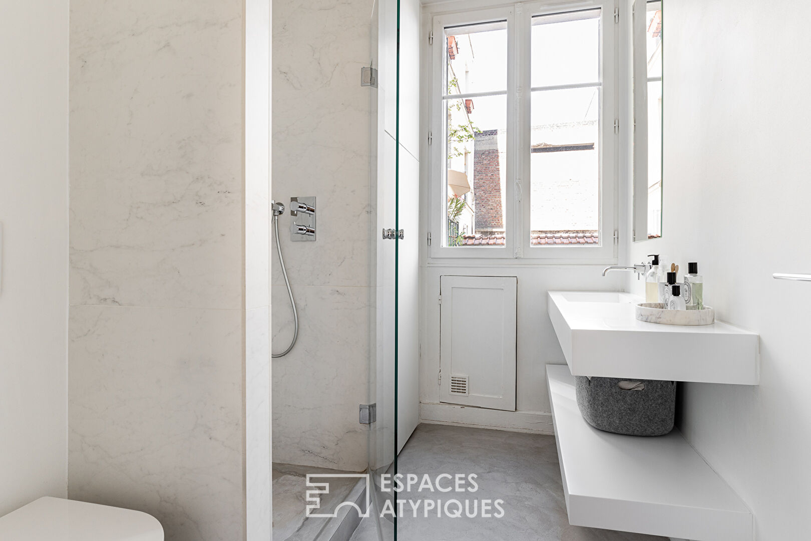 This living space, entirely renovated by an architect, benefits from an unobstructed view towards the small belt linking the Buttes Chaumont.