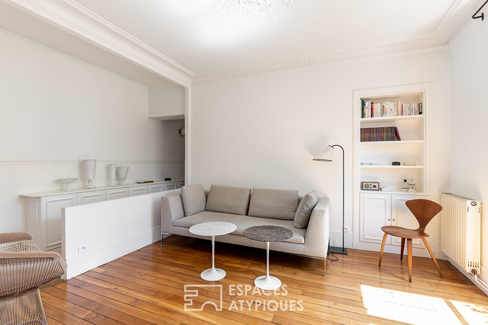 This place of life bathed in light cleverly combines the charm of the old with the parquet floor, the moldings and the original Prussian stove with a renovation and a resolutely contemporary decoration.