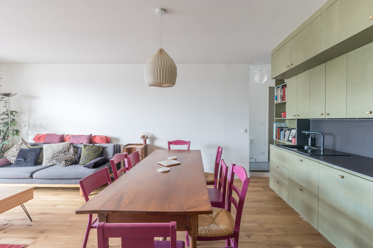 The entrance with storage, leads to an office, a guest toilet and a living room with open fitted kitchen of 25m2, bordered by a wide opening leading to a balcony with a view of the rooftops of Paris and the Sacré Coeur.
