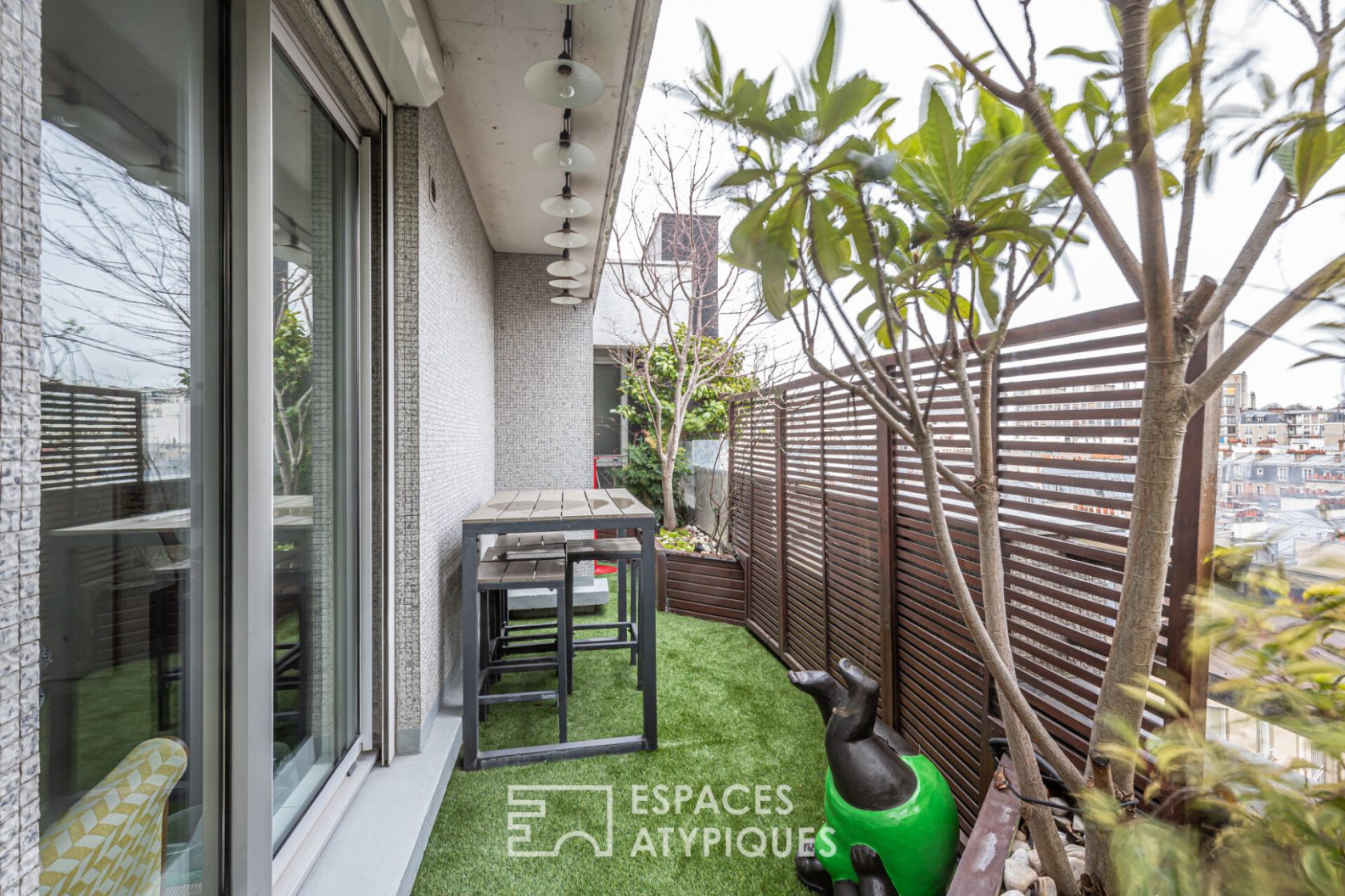Near the Parc des Buttes Chaumont, located on the 9th and top floor, this 73.30 m2 Carrez apartment is surrounded by tree-lined terraces totaling 39.10 m2.