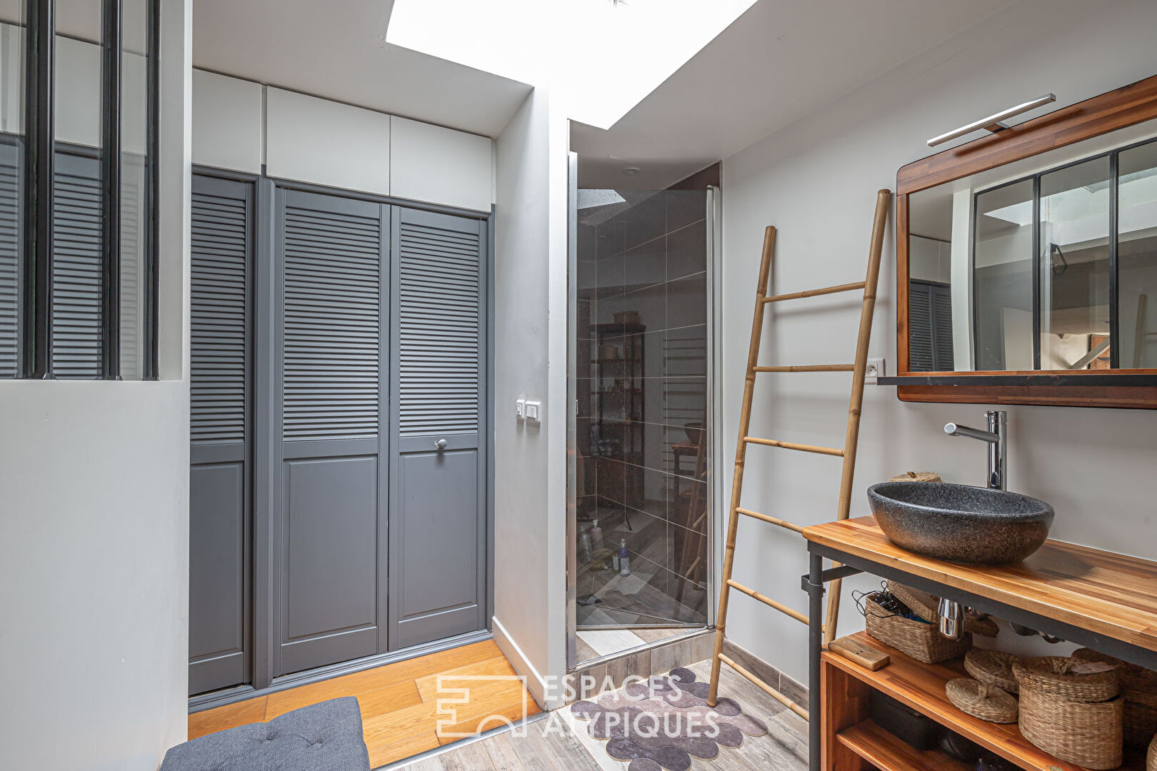 Characterized by its total calm while being in a resolutely urban environment, this duplex benefits from numerous storage spaces and custom-made joinery.