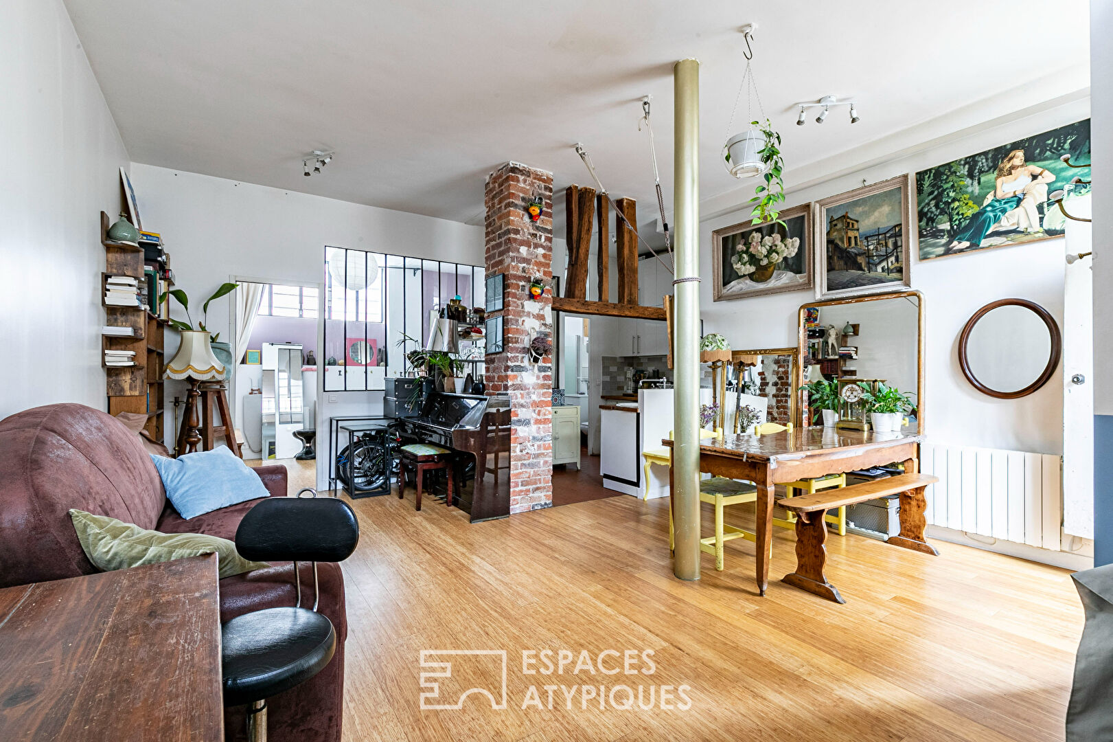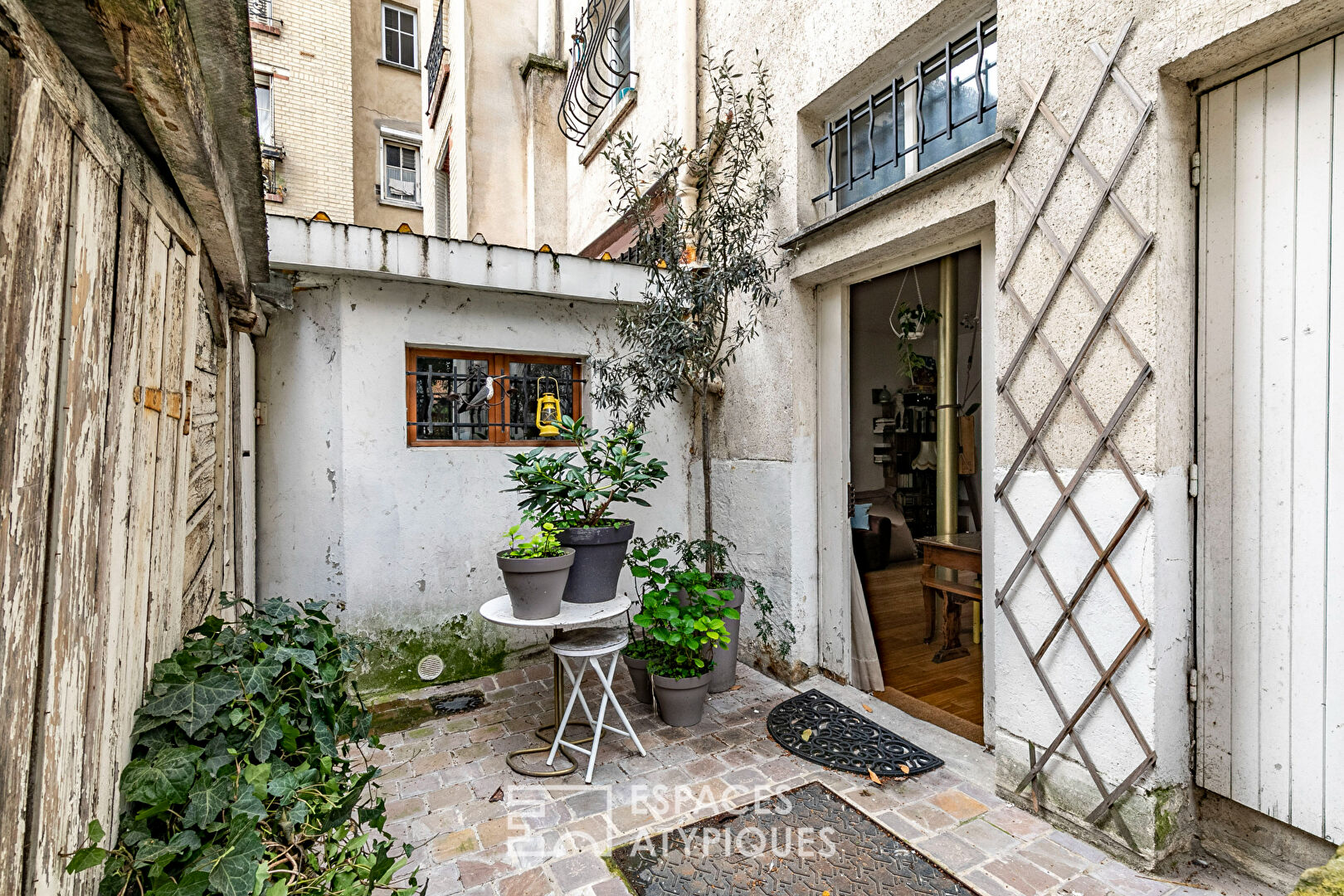 The courtyard of the building, bordered by old small coal shacks, leads to the entrance of this quiet place, the latest developments of which have revealed the original bricks and beams.