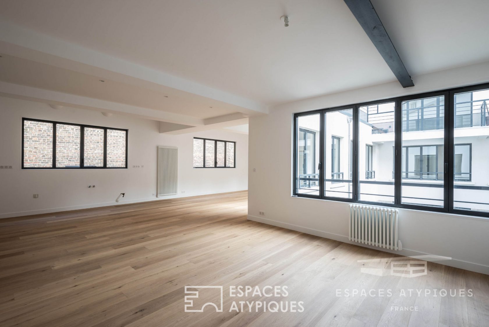 Close to Place Edith Piaf, behind a building, in a former printing factory rehabilitated s, 108m2 loft located on the 1st floor with elevator. The place includes a large living room with all the facilities for a kitchen to create, two bedrooms with a shower room for one, a bathroom for the other, and a laundry room. Depending on the needs, it is easily conceivable to create a third bedroom. The space is very quiet, it overlooks a central patio planted with trees, in common enjoyment. Beautiful benefits and brightness brought by the many openings that characterize the whole. A cellar is also proposed. Subject to the status of the condominium. Metro: Porte de Bagnolet Contact: Alain 06 23 64 20 04 Copropriété de 13 lots (Pas de procédure en cours). Charges annuelles : 3456 euros.