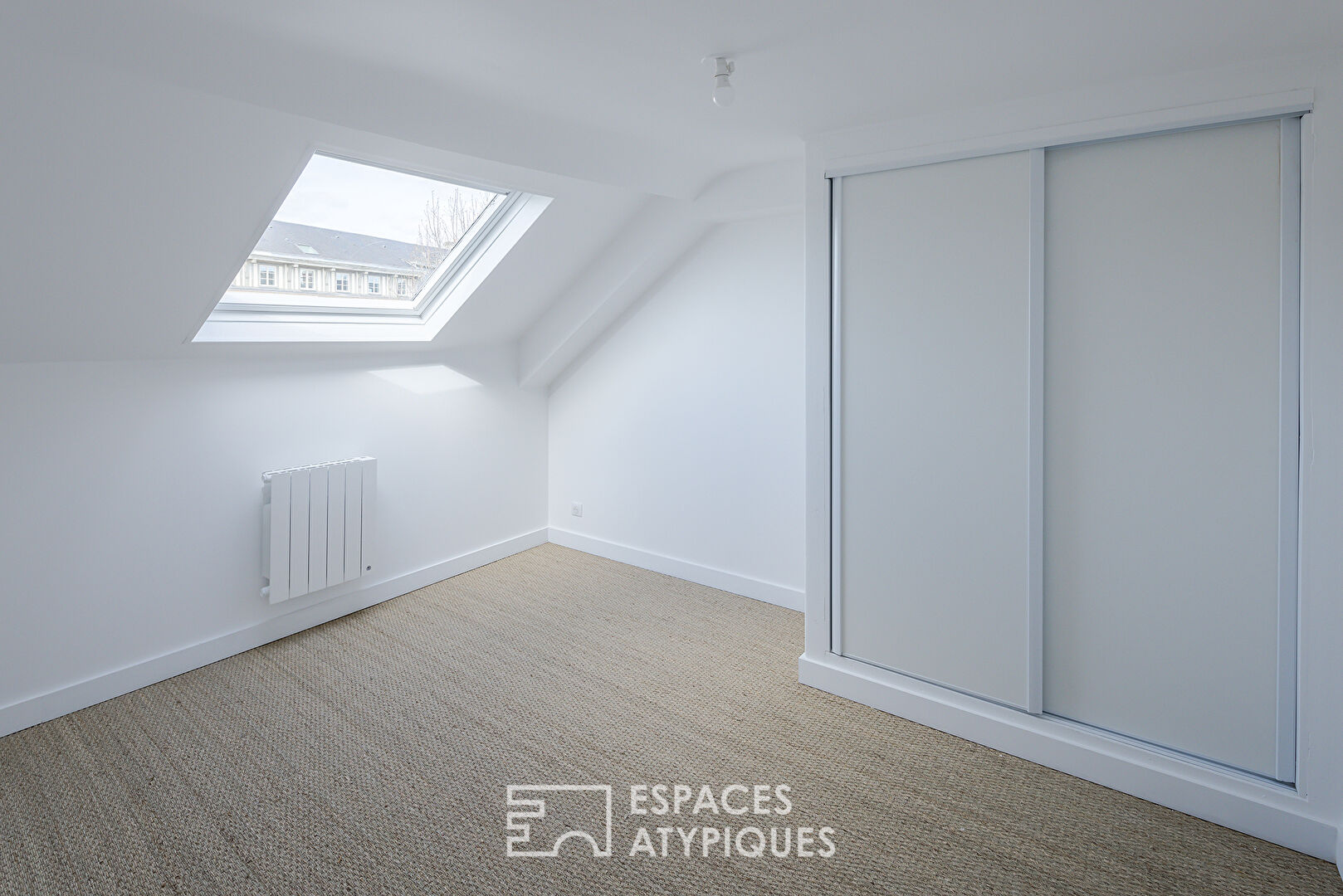 This apartment has many advantages to accommodate a family with a child or to offer a couple an isolated and bright teleworking space. It has a metal fireplace, large bay windows and remarkably appointed bathrooms. The attic rooms are decorated with exposed beams and seagrass floors, creating a warm and welcoming atmosphere.