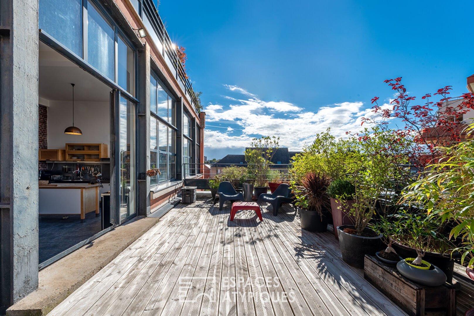 Passed the door, he is enchanted by the area of ??the loft of nearly 160m2 and surprised by the size of the masterful bay windows 4 meters high, bringing remarkable light and opening onto a 55m2 terrace with trees allowing multiple layouts.