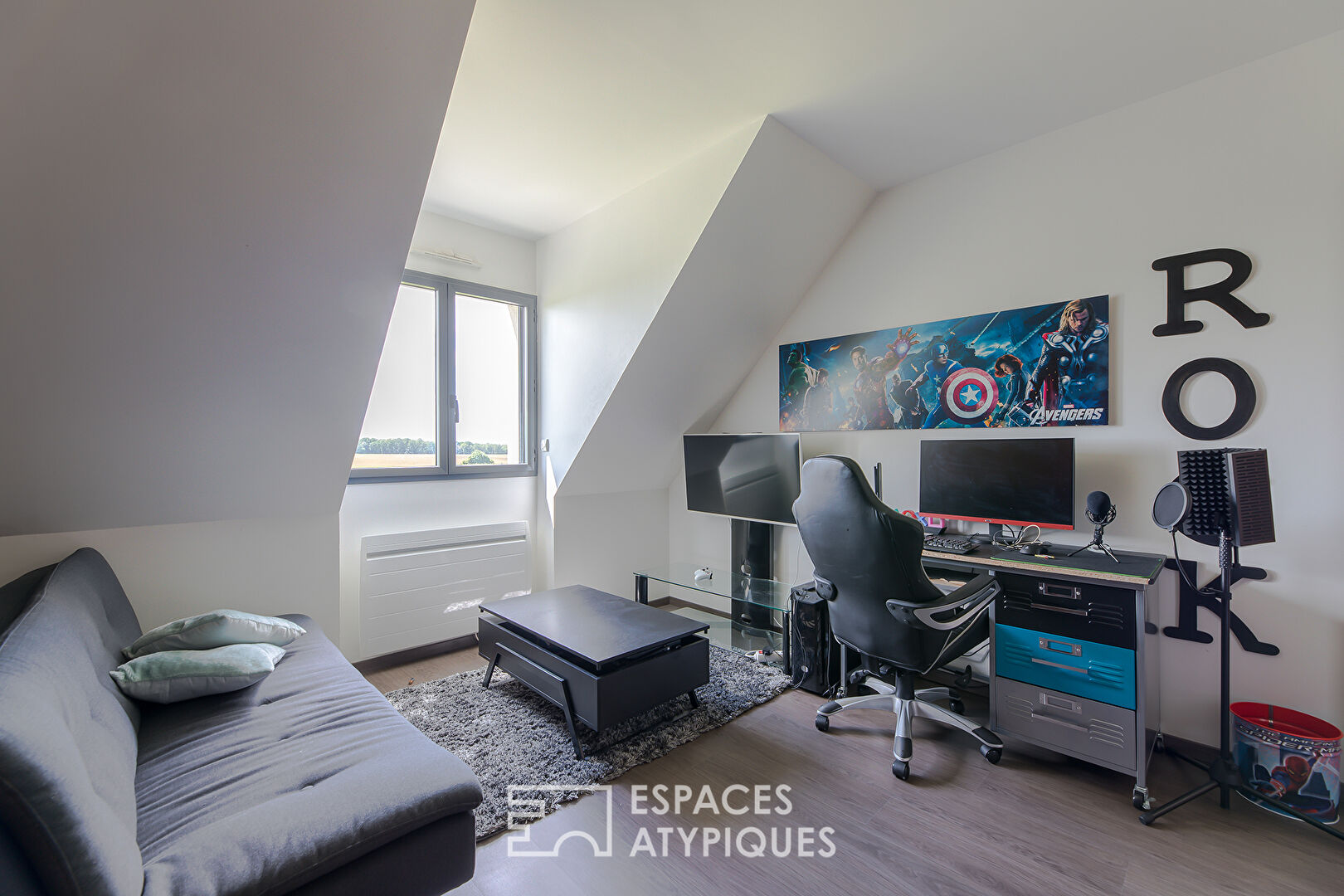 From the entrance, the gaze is on the heart of this house with an 85 sqm living room, open to a friendly space, bathed in light with large bay windows and magnified by its cathedral ceiling.