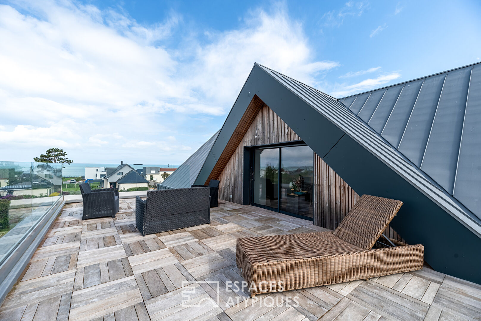 With a magnificent zinc roof, pretty skylights and white stones, the exterior style is resolutely modern, the exposure to the South and West towards La Manche is ideal for benefiting from beautiful light and the sun throughout. the year.