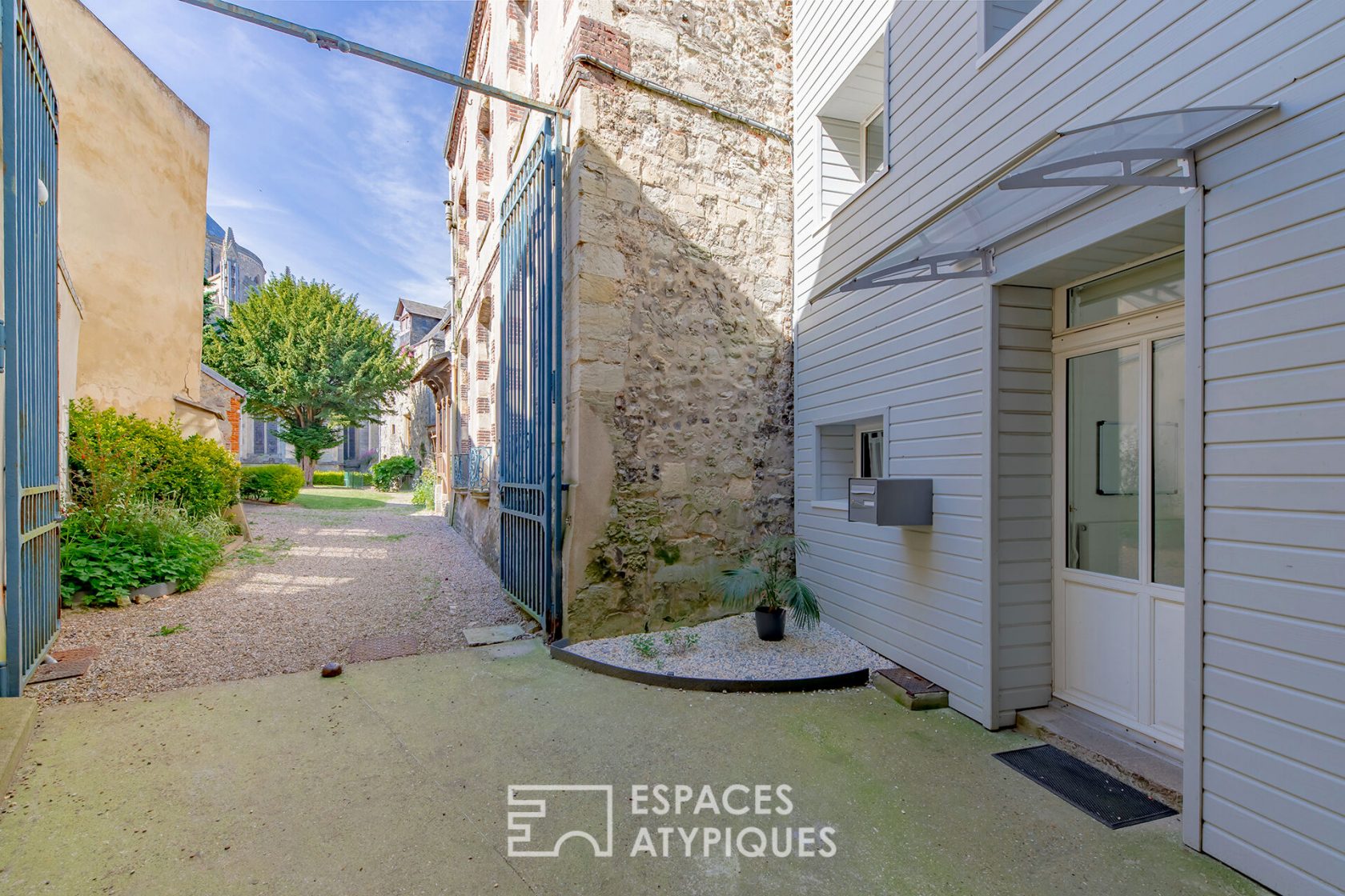 Beyond its originality, the interest of this house is that it has undergone major renovations: insulation, cladding, windows, roof. It has become a real cozy nest in the heart of the city, with the precious possibility of entering your vehicle in the courtyard just in front of the front door, while directly enjoying the soothing atmosphere of the pretty garden of the old town. presbytery, dominated by the imposing steeple of the abbey.