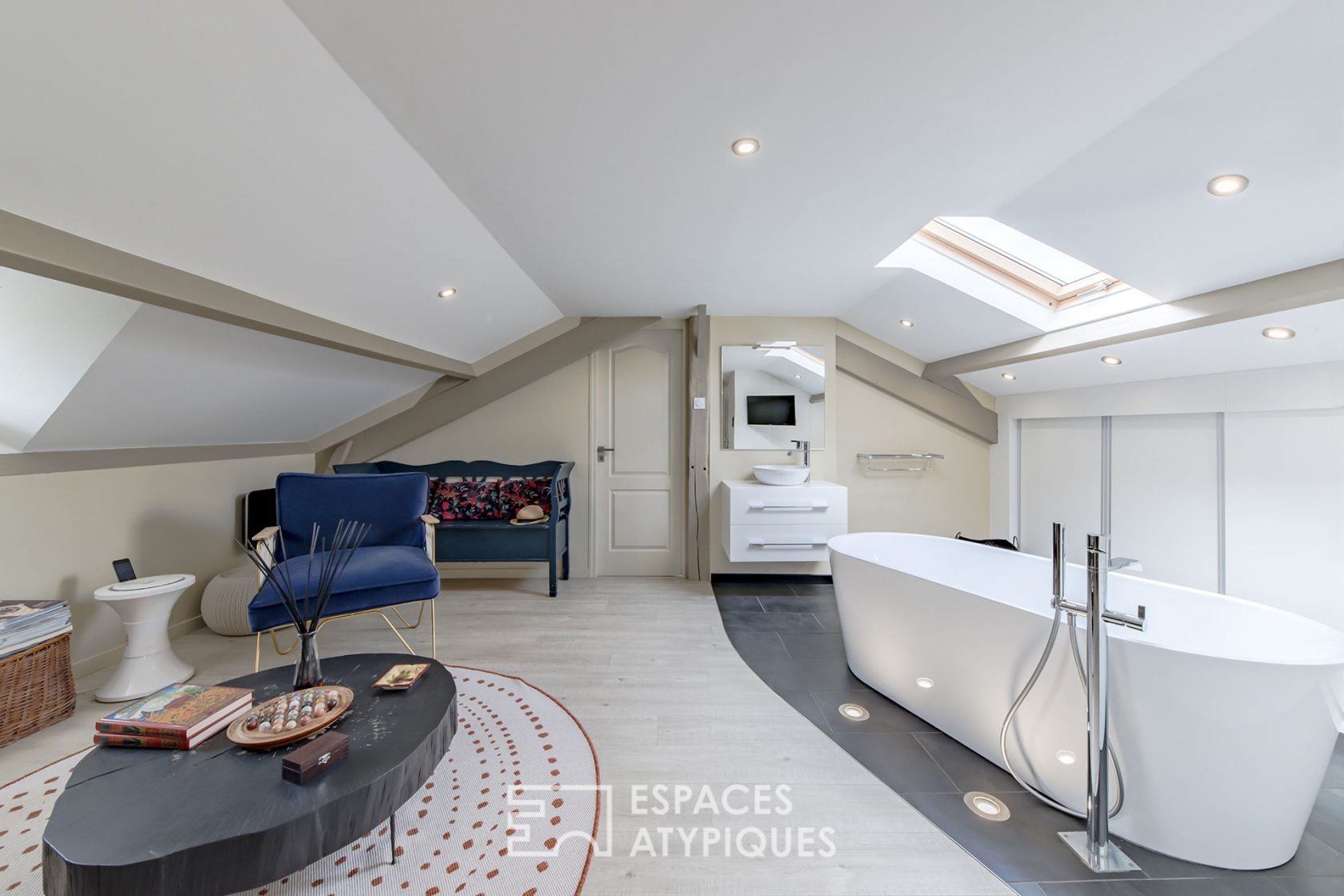 The visitor then accesses a spacious mezzanine hosting a “sports room” section, an upstairs living room and a bathroom with free-standing bathtub which catches the eye that the recessed spotlights in the ground highlight.