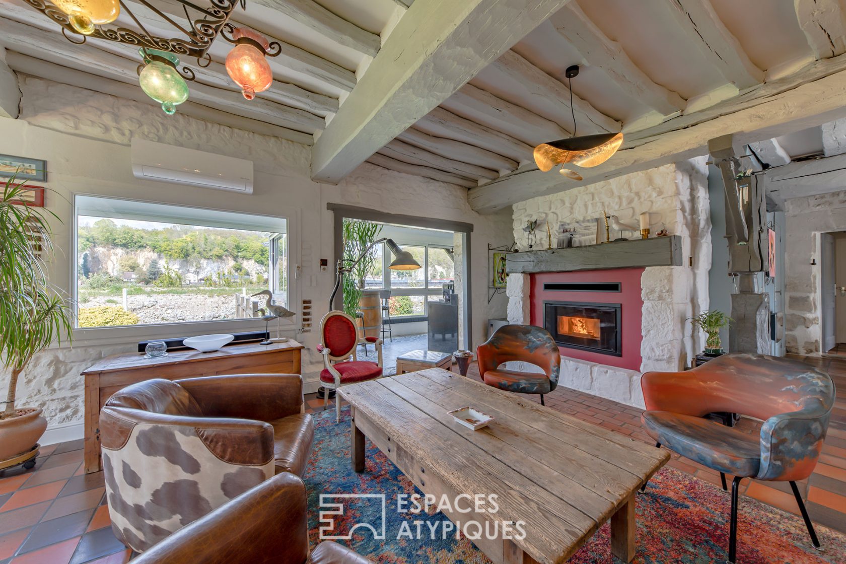 “Bohemian chic” style decoration, mix of materials, old tiles, cut stones, exposed beams, panorama of the Seine and the chalk cliffs … all the codes of the Norman postcard are present.