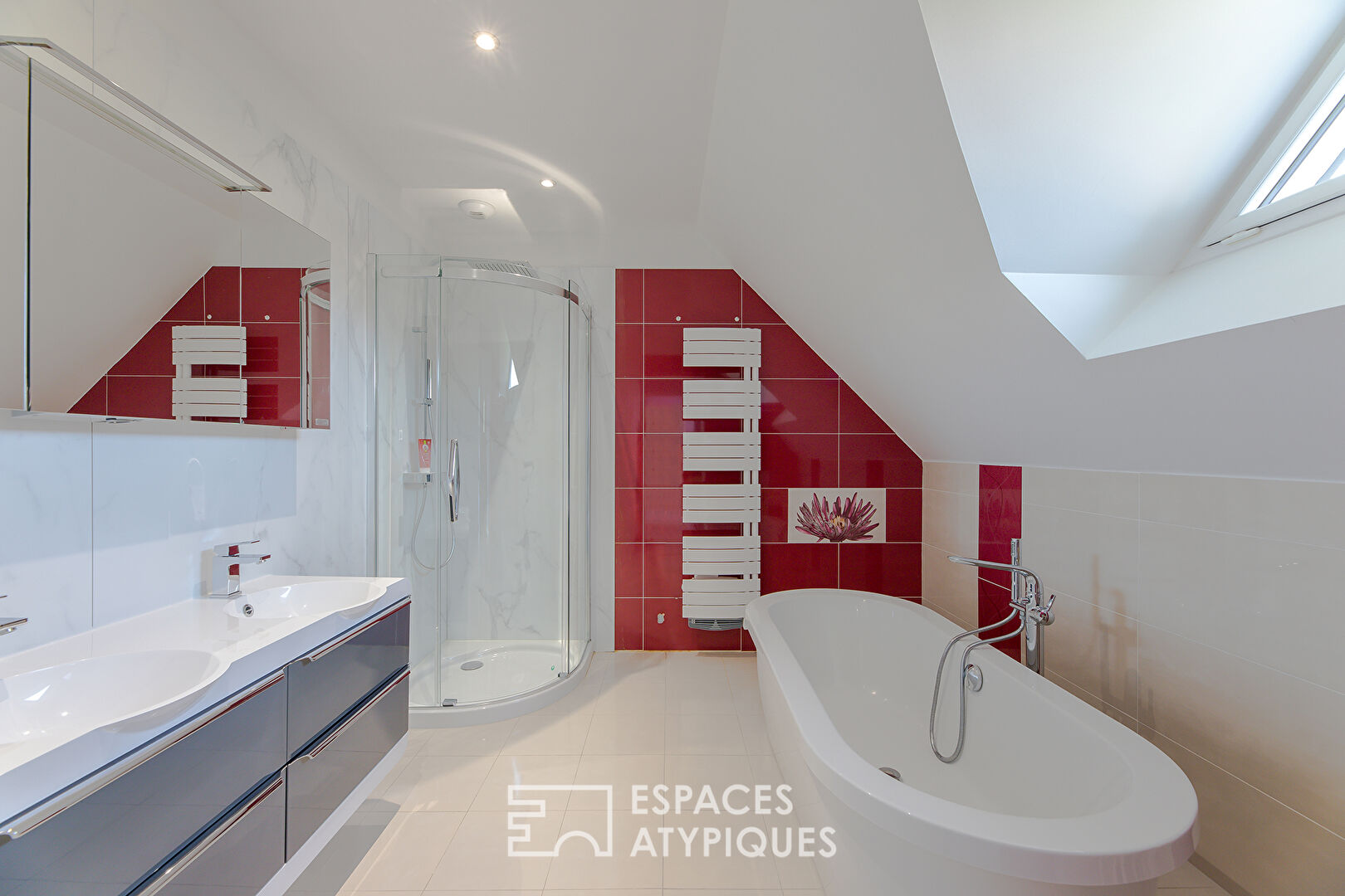 Located in a peaceful area on the Paris-Deauville axis in an environment close to shops, this architect-designed house will seduce with its contemporary and modern appearance.