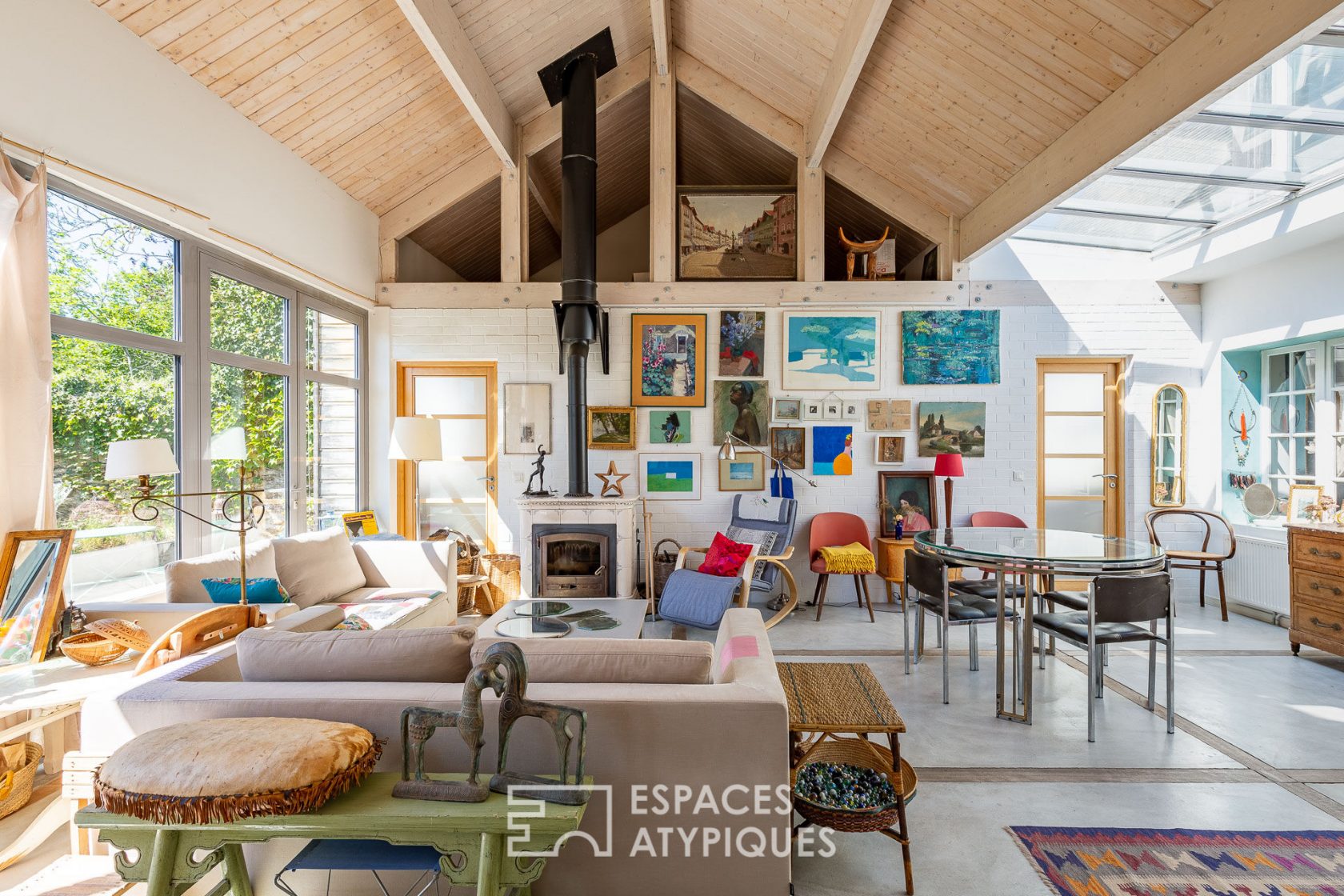 Located in the charming town of Vaux le Pénil, close to all amenities, this house offers an area of approximately 180sqm on a plot of 530sqm. Benefiting from a contemporary extension of 90sqm adorned with Red Cédar wood cladding, this small house has turned into a beautiful family home in a bohemian chic and very warm atmosphere. Set back from the street, the house opens onto a beautiful entrance which distributes on one side a magnificent and spacious living room of 90sqm covered with a concrete and wood floor. This room entirely facing the south-facing garden enjoys incredible light thanks to numerous openings and a large skylight. This room invites to spend good moments of conviviality with its open kitchen. Benefiting from a beautiful height under ceiling, it is also conducive to artistic creation. Night side, we discover two bedrooms including a master bedroom with a large bathroom and a dressing room. A room currently used as an artist’s studio and office completes this level. A staircase mixing wood and concrete leads to the first floor which serves two attic bedrooms. They share a bathroom. A room which can be converted into a dressing room completes the first floor. The perfectly maintained exteriors offer a small shaded courtyard at the front and a magnificent walled garden with its wooden terrace to enjoy the beautiful days. A stone well can be used to maintain the garden. Blow of heart for this atypical property which will seduce by its location, its beautiful volumes bathed in light and its outside space in peace and out of sight. 15 minutes by car from Melun station with access to Paris Gare de Lyon in 25 minutes