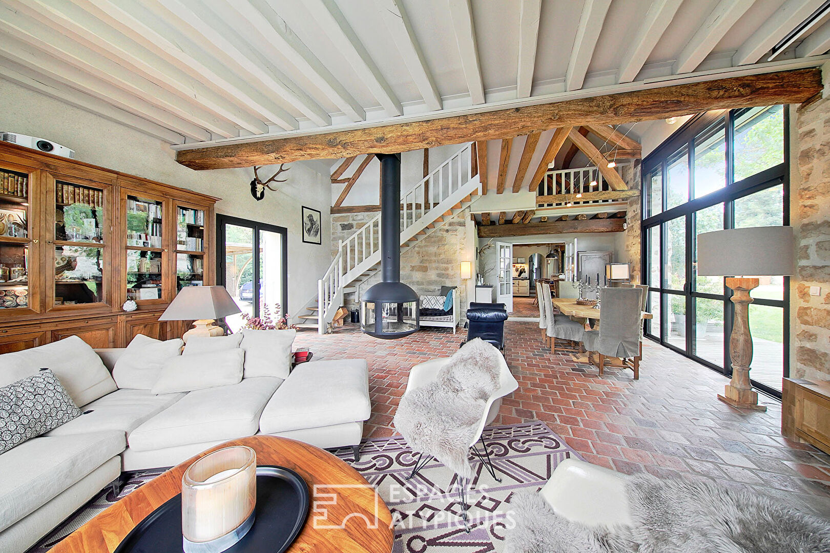 25km from Fontainebleau, located in a charming village, this old farm of 260m2 is built on an enclosed plot of 2643m2. It has been renovated by an architect in order to preserve its charm and authenticity, while giving it a very contemporary spirit and for maximum comfort. This beautiful property out of sight which offers a breathtaking and completely unobstructed view of the surrounding nature, will appeal to lovers of the countryside looking for a property combining character, charm and all modern comforts imbued with high quality materials. The entrance of the house opens onto a beautiful cozy living room with its fireplace, its beautiful wooden beams and its magnificent floor tiles. On one side, we discover a fitted vestibule, a first bedroom with its large dressing room and a bathroom. On the other side, there is a beautiful kitchen with high quality equipment and a back kitchen, also fully equipped. On the living room side, a pleasant volume and beautiful spaces combining stone and wood and embellished by a magnificent suspended Focus wood stove. Large, full-height windows bring a very beautiful light to this room. They offer a permanent link with the surrounding nature and allow you to enjoy the large heated swimming pool and its west-facing wooden terrace. A staircase leads to the first floor which offers on one side a spacious mezzanine that can be converted into a bedroom, and on the other a landing which leads to three large bedrooms, one of which has a bathroom and two others benefiting from numerous storage spaces designed custom made. A bathroom completes this level. Three parking spaces under a canopy, a pool house, a garden shed and a nice storage space for wood complete this set. Shops 3km away/Near the Fortress golf course 25km from Fontainebleau/14km from Moret-sur-Loing (access to the train station for Paris 45 mins away)/ 15 km from the A6 motorway, exit Nemours (access to the train station for Paris 50 mins away ) ENERGY CLASS: D / CLIMATE CLASS: E.