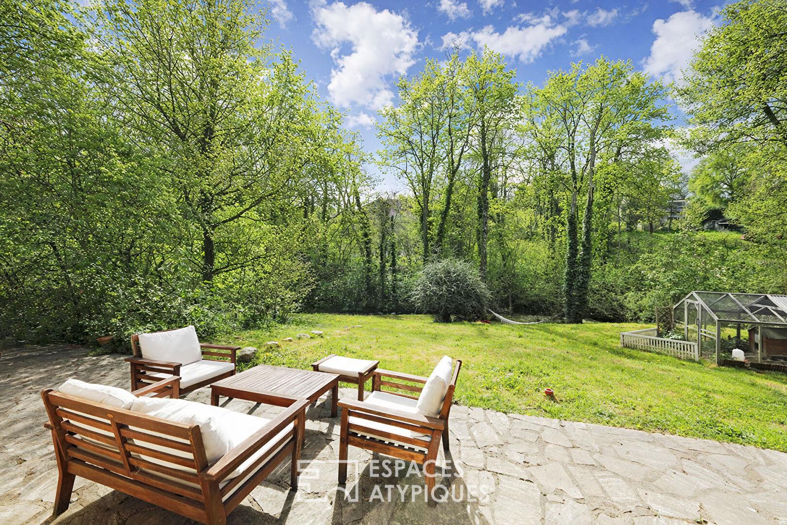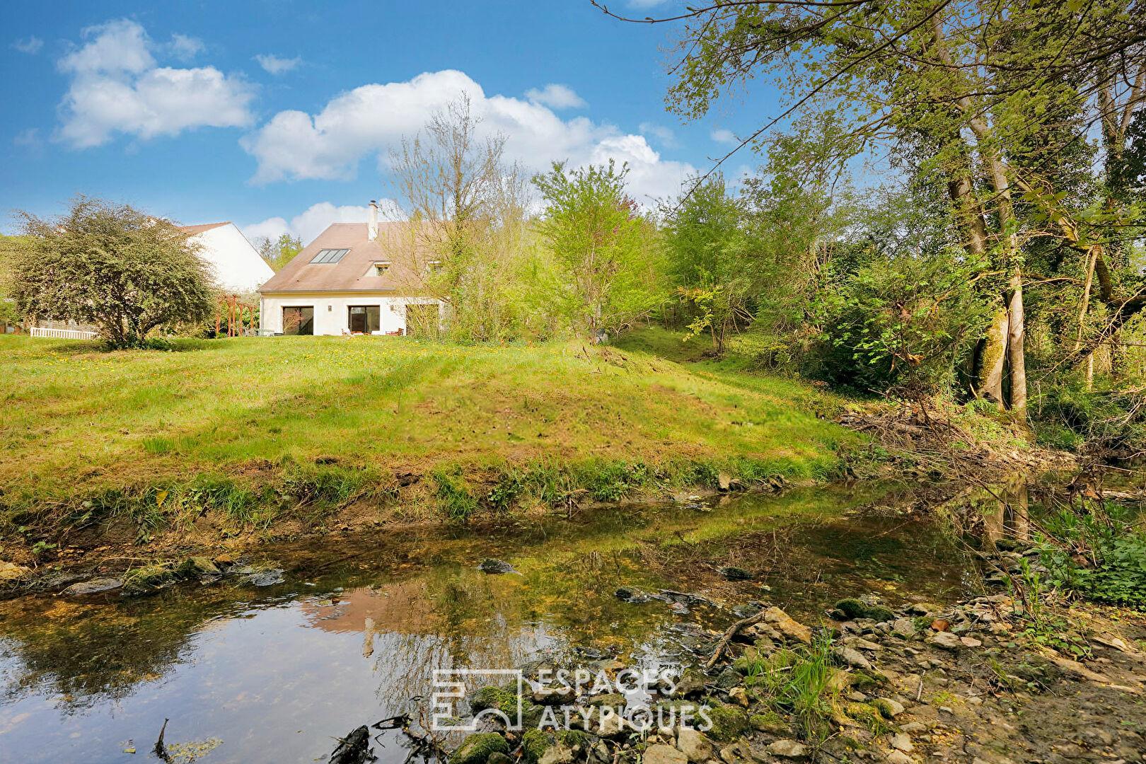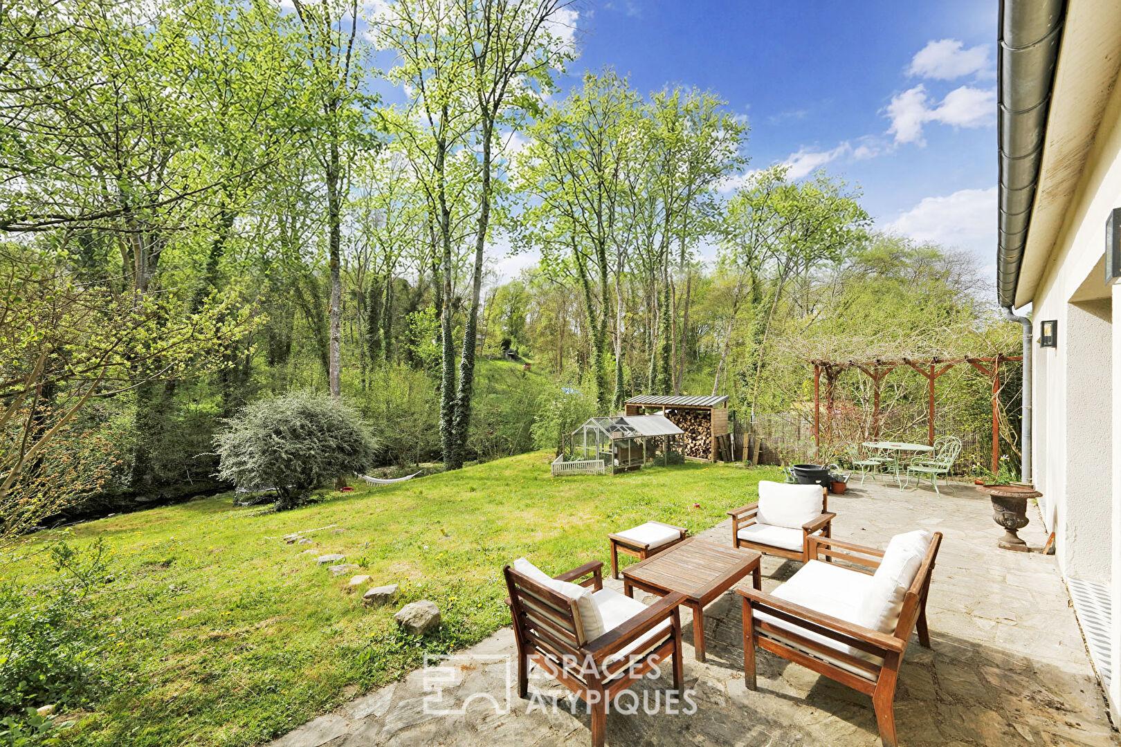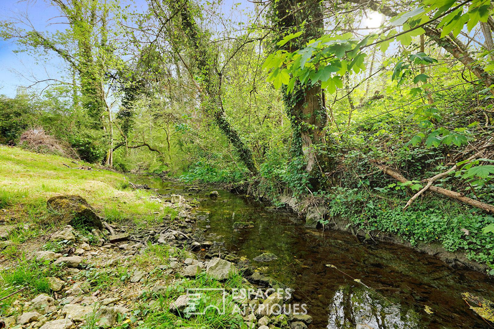 Outside, a landscaped garden extends the experience, a verdant haven of tranquility bordering a charming little stream, conducive to a peaceful and secluded lifestyle. A large garage/workshop completes this property, ideal for DIY enthusiasts, artists, or for parking several vehicles.