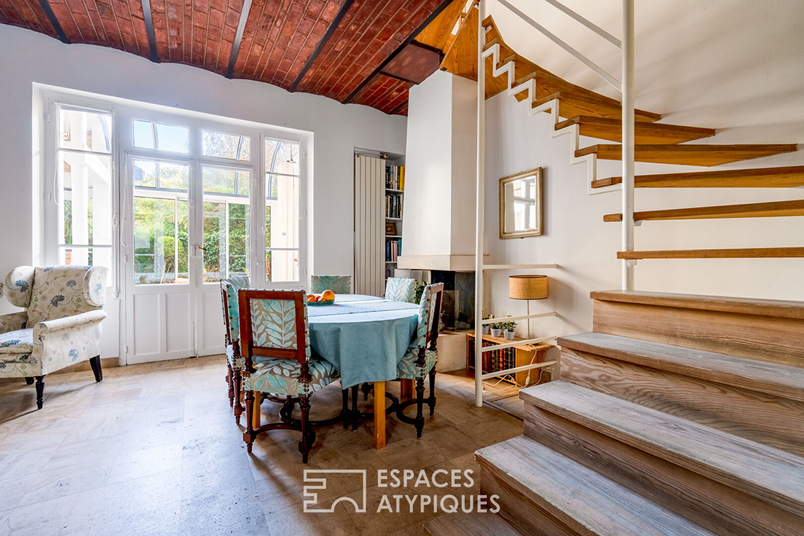The entrance opens onto the dining room / living room which develops an area of 25 sqm, under 3 m high under a ceiling in red brick vaults, decorated with a fireplace. The 10 sqm kitchen has taken place in continuity in the glazed extension, facing the garden facing south / east The staircase designed by an Architect serves a first plateau of 23 sqm split into two sleeping areas, one of which benefits from a ‘a bow window, the other a balcony, and which share a bathroom.