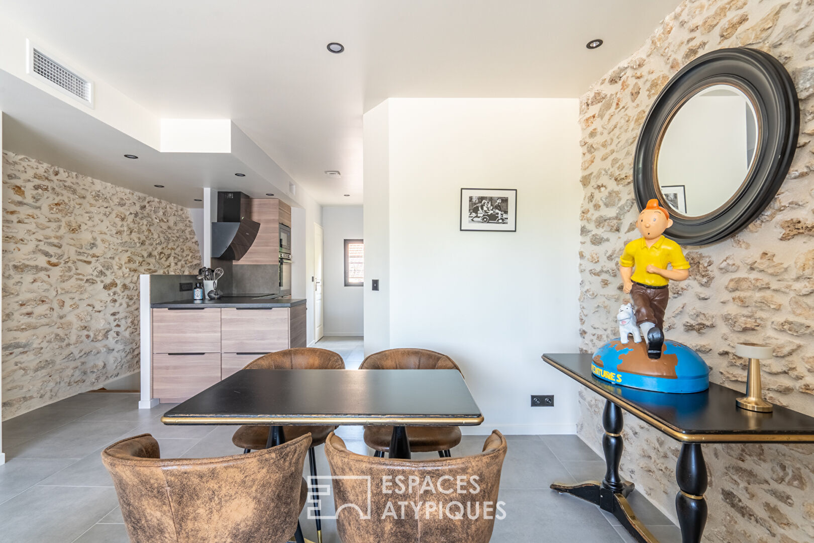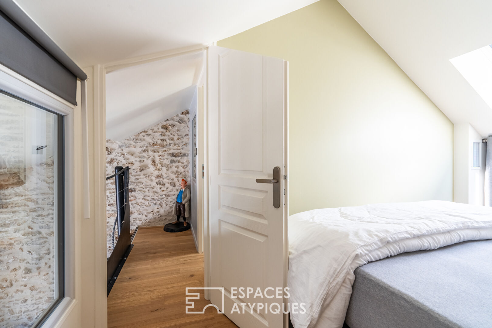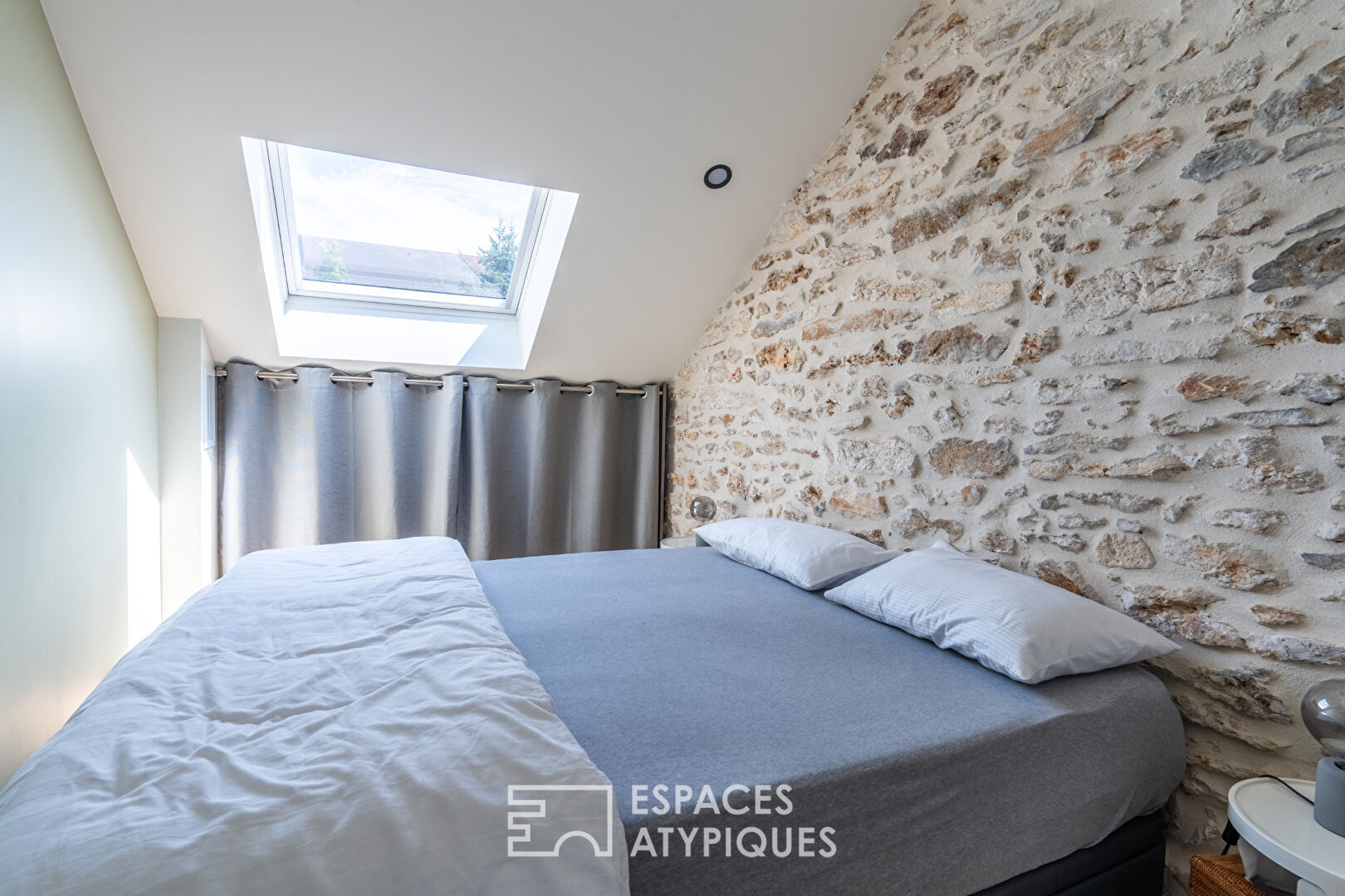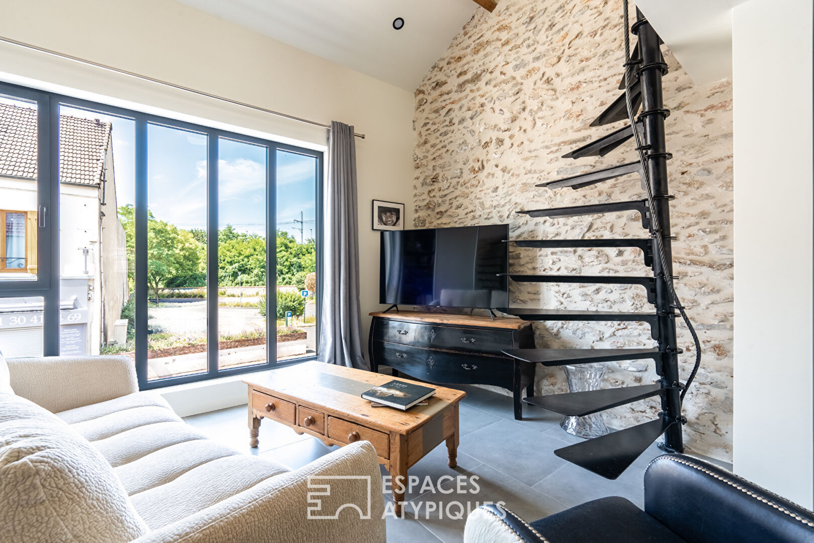 The entrance leads to a beautiful living room of 30 sqm with atypical volumes, decorated with a designer staircase inspired by the Roger Tallon style. It has plenty of storage space, a modern and equipped kitchen, a bathroom with double sink, a separate toilet and a laundry room.