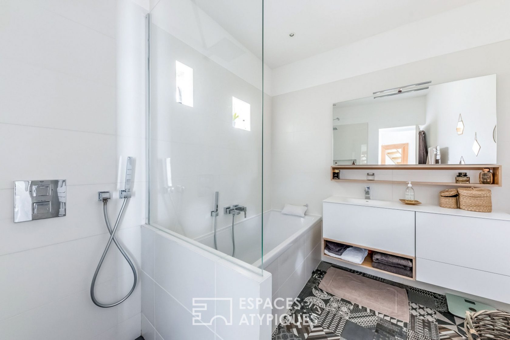This large town house of 158m ² is located in Le Bourg, very popular area of La-Celle-Saint-Cloud, along the park of the Castle. The renovation of this building in the form of arrowhead has been achieved with harmony by integrating skylights and contemporary materials with an inverted duplex layout.
