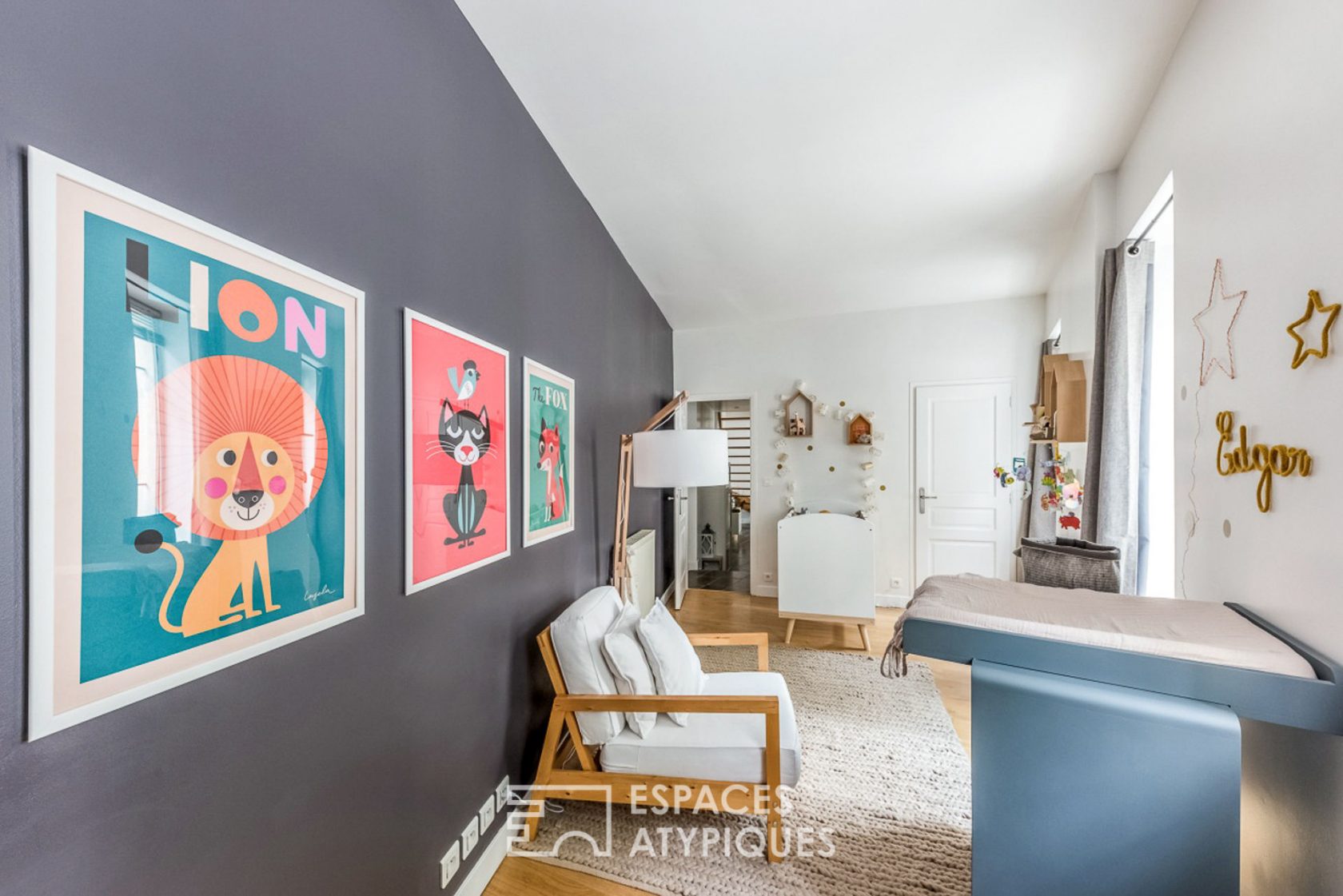 The open wooden staircase leads to the living room of 3 5m ² with solid oak floor, opened by a rust effect canopy on the fully equipped kitchen with its central island in symmetry with the shape of the kitchen whose work tops remind the Color of the canopy. Three wells of light decorate this space which extends on a fourth room and a second bathroom and an independent WC.