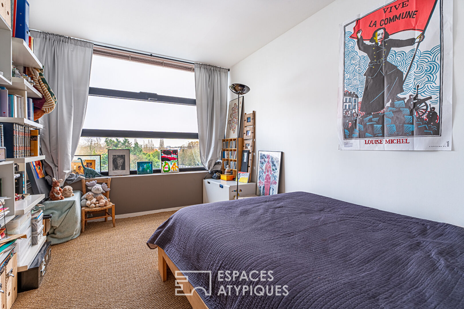 In the heart of the city center, nestled in an island that is unsuspected from the street, this magnificent duplex loft, designed by architect Dominique Perrault, covers 153 sqm spread over two levels. A bay window of remarkable proportions illuminates the living space, offering a clear and unobstructed view of the Parc des Sources de la Bièvre (woods, pond and forest).