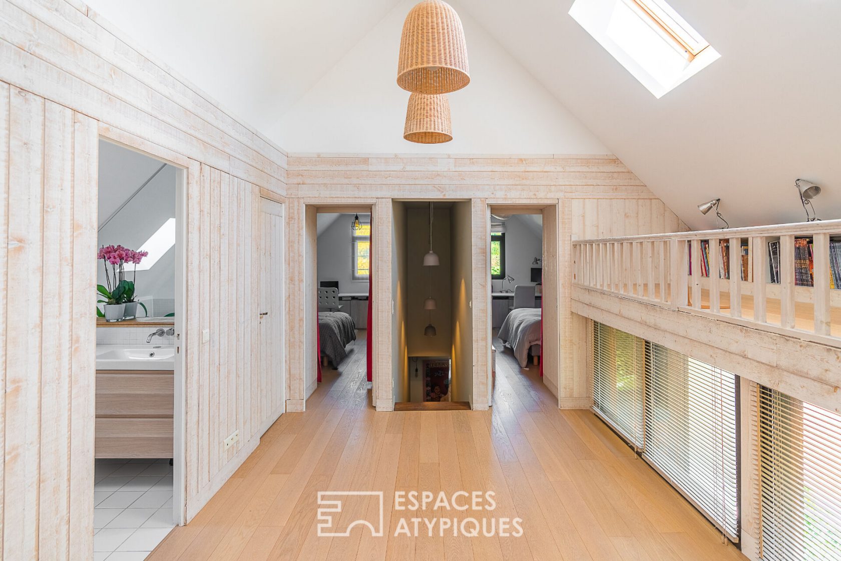 On the 1st floor, four bedrooms share a landing which constitutes a real living room: gym, reading corner, once again, the house becomes a chameleon. The parental suite bathed in light seems to be suspended outside: you can sleep there in the middle of nature!
