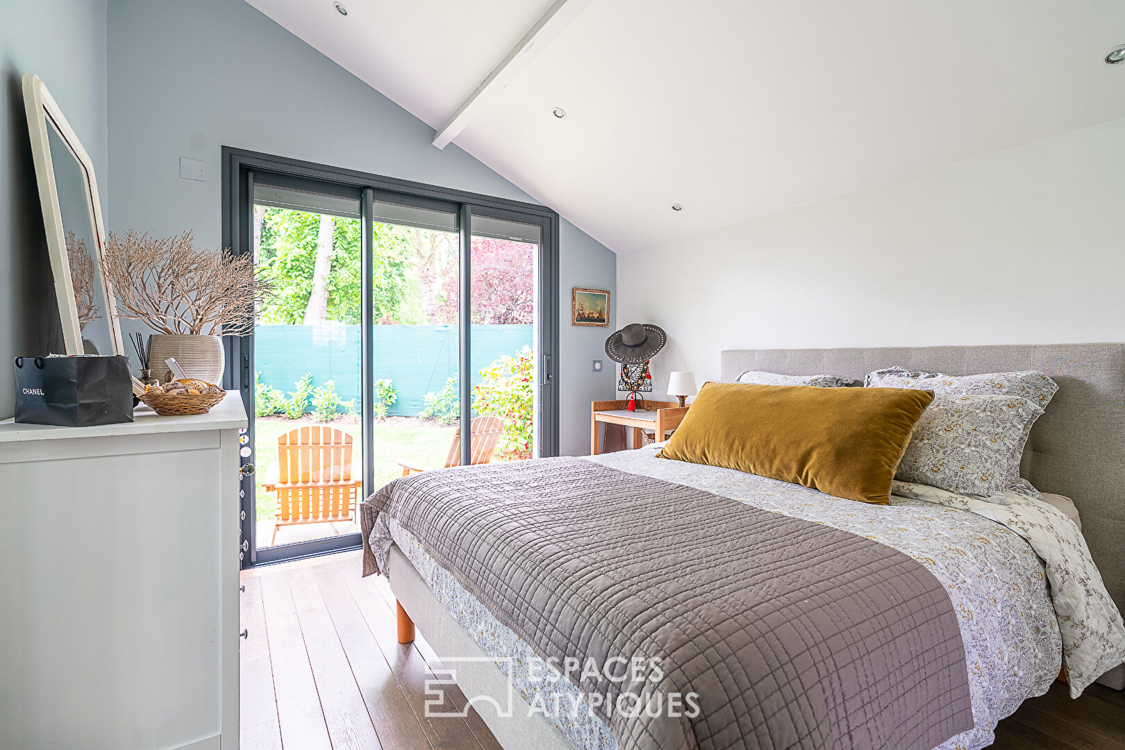 The entrance has a large hallway filled with dressing room: ideal for the family! Still on the ground floor, the master suite with its terrace overlooking the garden hides not only a boudoir bathroom but also, in its continuity, a laundry room: the distribution of this house surprises with its practicality and suggests a magnificent family organization! To complete the level, a second bedroom with bathroom, an independent WC, and an office allowing you to isolate yourself for teleworking.